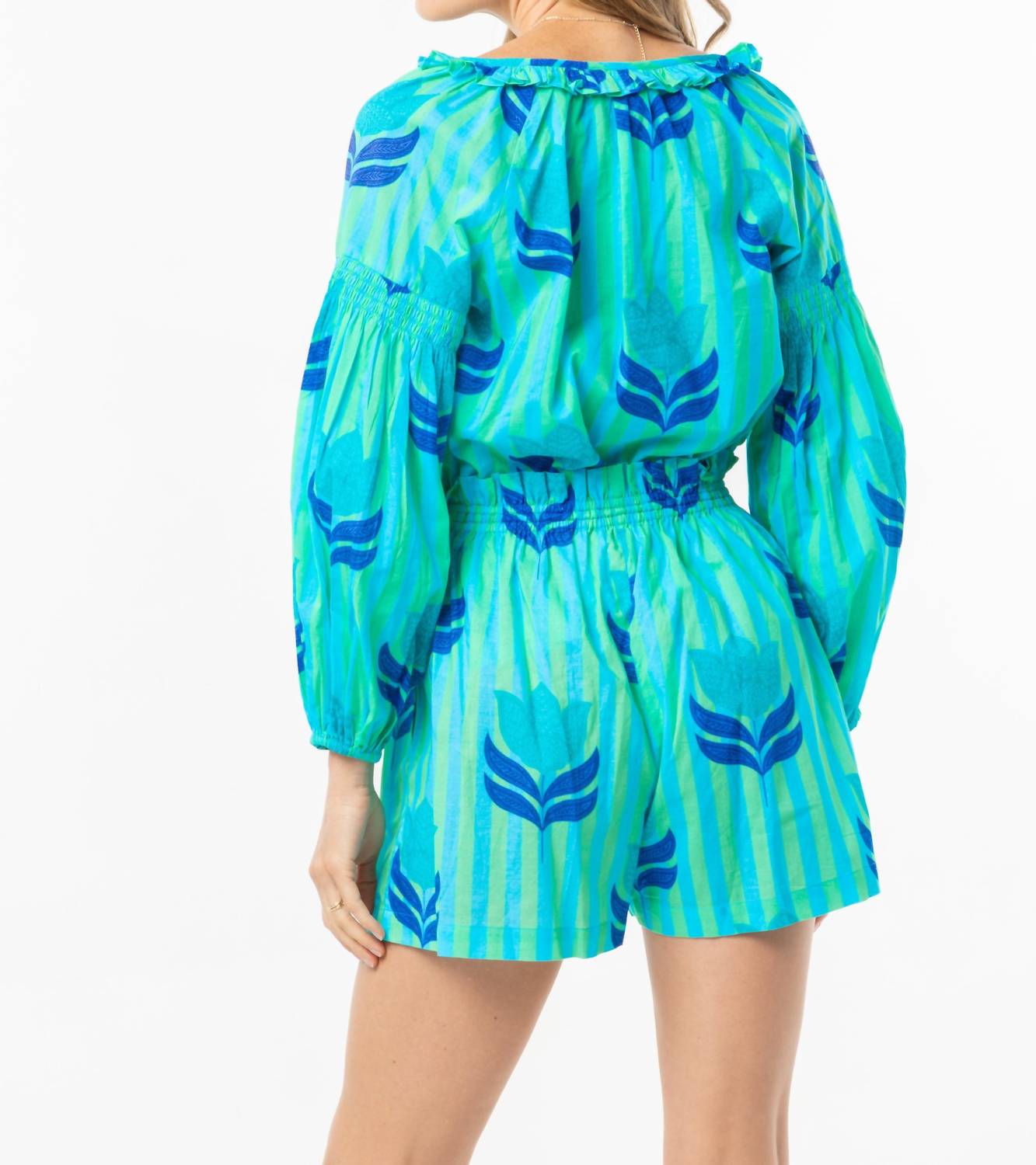 Tuck your favorite tee into these high-waist shorts for a more casual-cool feel. Introducing the Carlie Stripes and Tulip Print Shorts by Bindu, a vibrant addition to your summer wardrobe in turquoise tulip. Crafted with a high waist and floral pattern, these shorts are designed for a stylishly relaxed fit. Featuring convenient pockets and a pull-on closure, they are perfect for a breezy vacation vibe. Care is simple: machine wash and lay flat to dry.