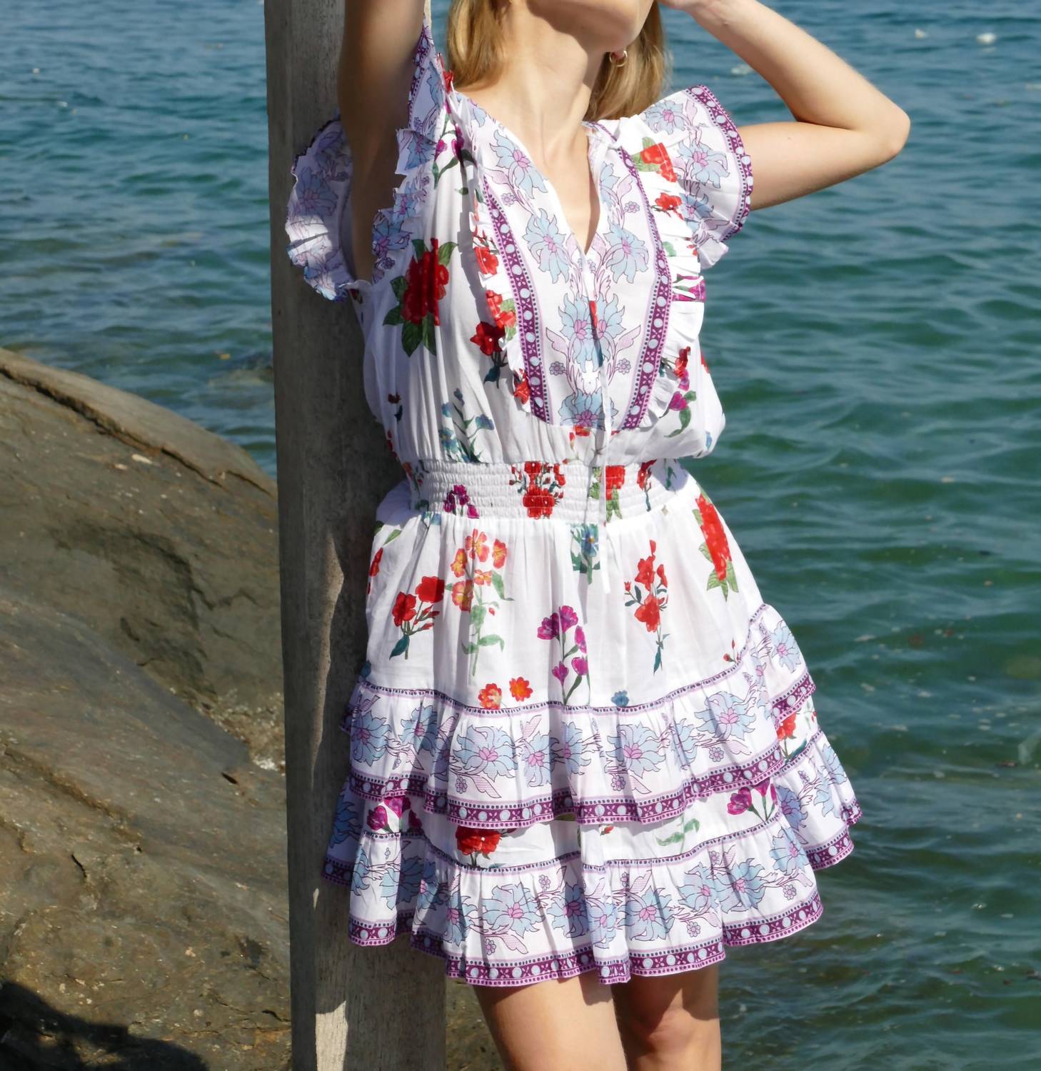 A short and breezy dress for those warmer days. Introducing the Sky Dress Mini Dress by Bindu, a whimsical choice for the ultra-feminine girl. Featuring cap sleeves and crafted from cotton, this patterned A-line mini dress showcases romantic block-printed wild flowers ideal for a summer vacation look. It offers a relaxed fit with a V-neckline and a flowing skirt, complemented by a button closure. Care for this dress by washing it on a cold delicate cycle or hand wash, laying flat to dry, and low ironing or steaming if needed.