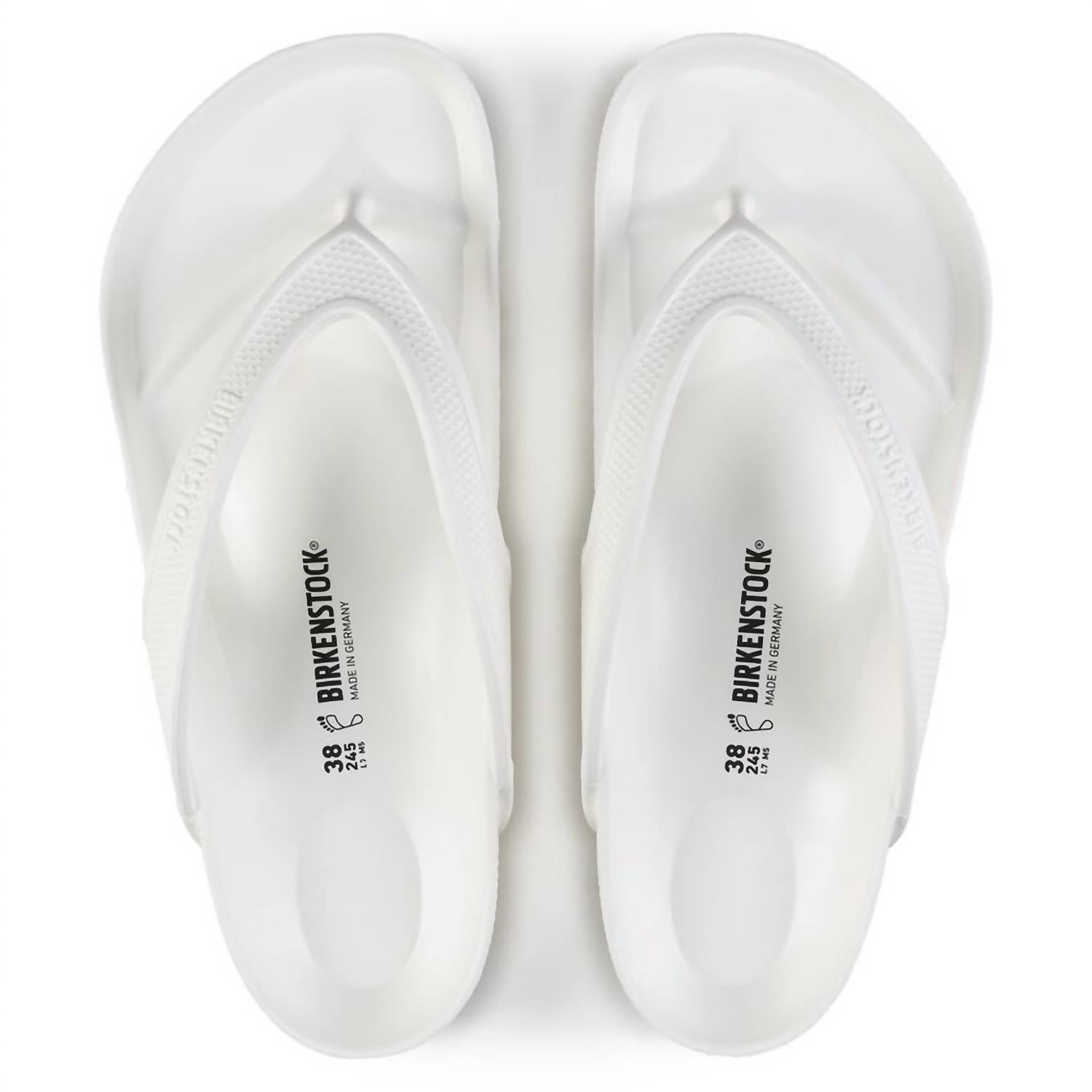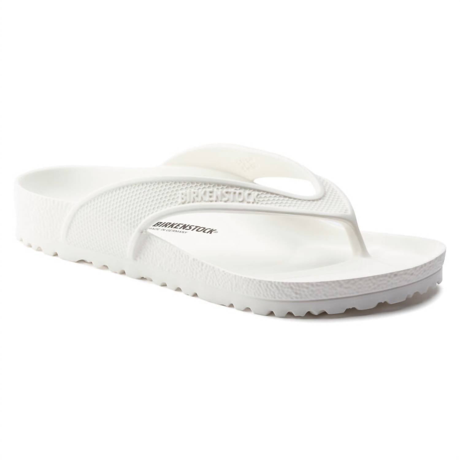 Step into comfort with the BIRKENSTOCK Honolulu Eva in white, a sporty thong sandal designed for both style and practicality. Constructed from a single piece of EVA, this ultra-lightweight sandal is waterproof and washable. Made in Germany, it features an anatomically shaped BIRKENSTOCK footbed for lasting support. Perfect for beach days or casual outings, enjoy the flexibility and durability of this essential sandal.