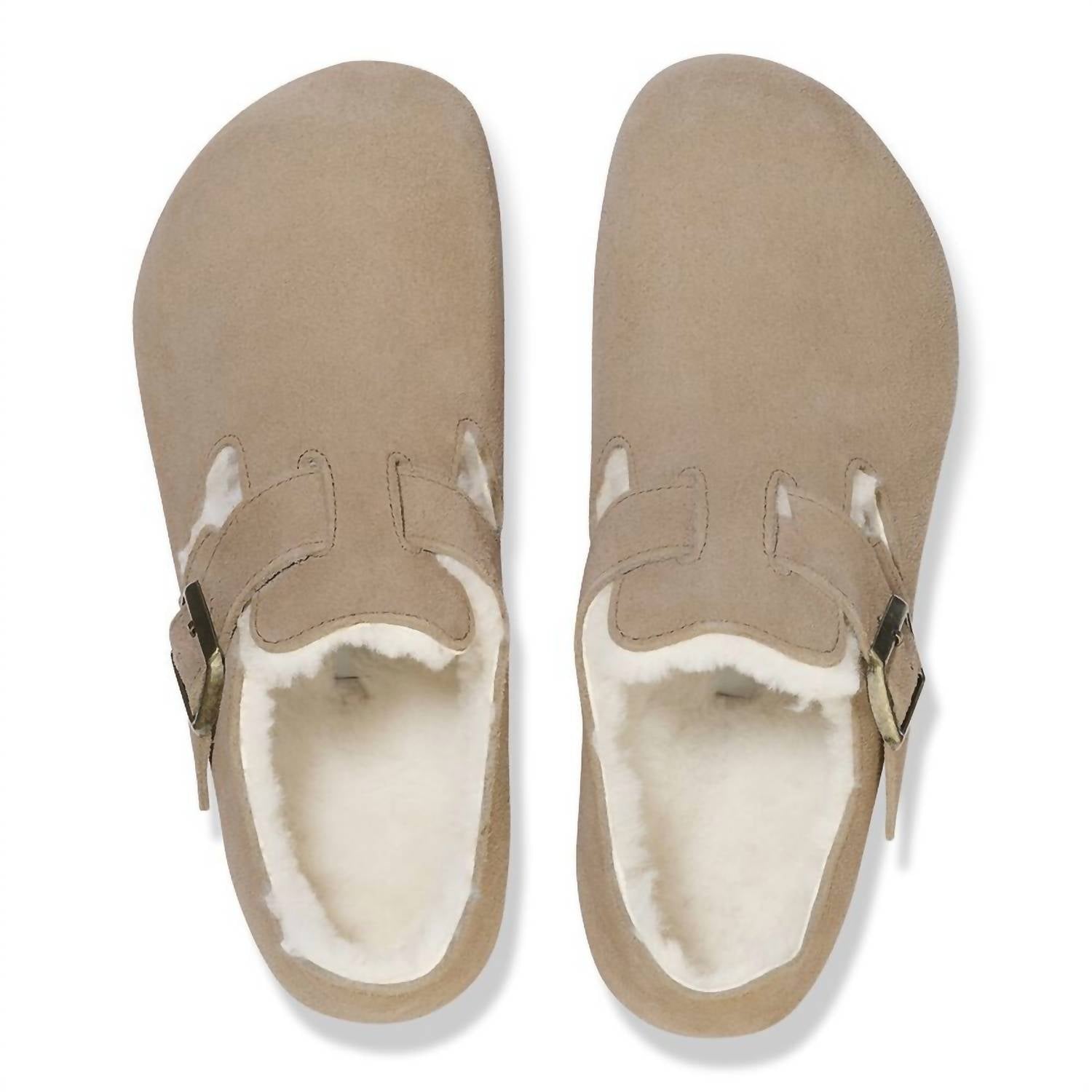 The London shoe is defined by its clean, minimalist lines and adjustable buckled strap, offering a timeless and versatile look. This version is lined with cozy shearling for added warmth, paired with a soft suede upper for a refined finish. An anatomically shaped footbed provides natural support, while the lightweight EVA sole ensures flexibility and comfort.
