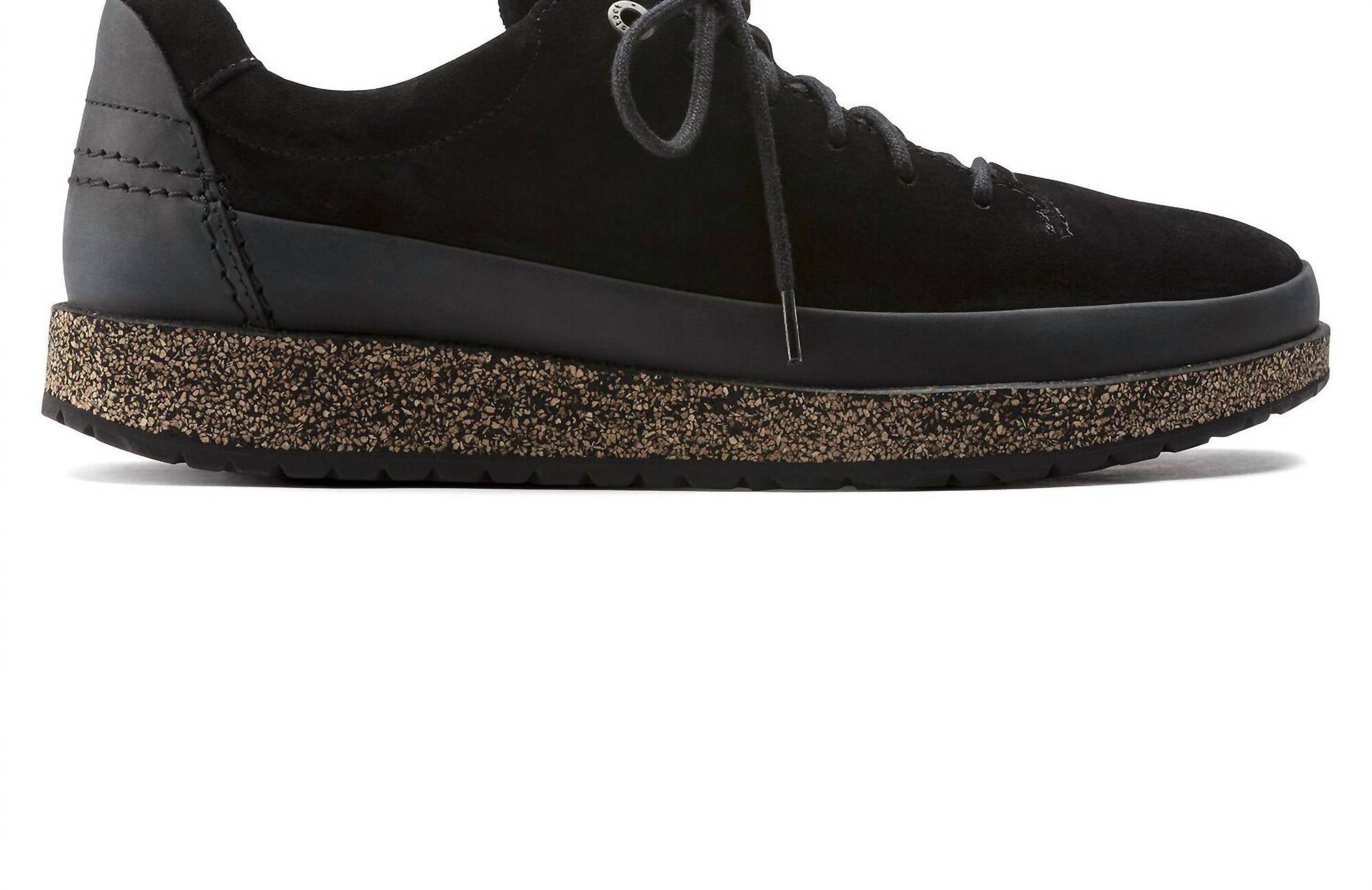 Step into comfort and style with the BIRKENSTOCK Honnef Low Shoes, crafted for both men and women. These unisex sneakers in sleek black feature a durable and easy-to-clean suede upper with fully adjustable lacing for a perfect fit. Engineered in Portugal, the shoes boast a Deep Blue Footbed including a microfiber liner, cork and jute layers, and a PU base for premium arch support and shock absorption. Experience enhanced grip and durability with the injected rubber outsole, perfect for all-day adventures.