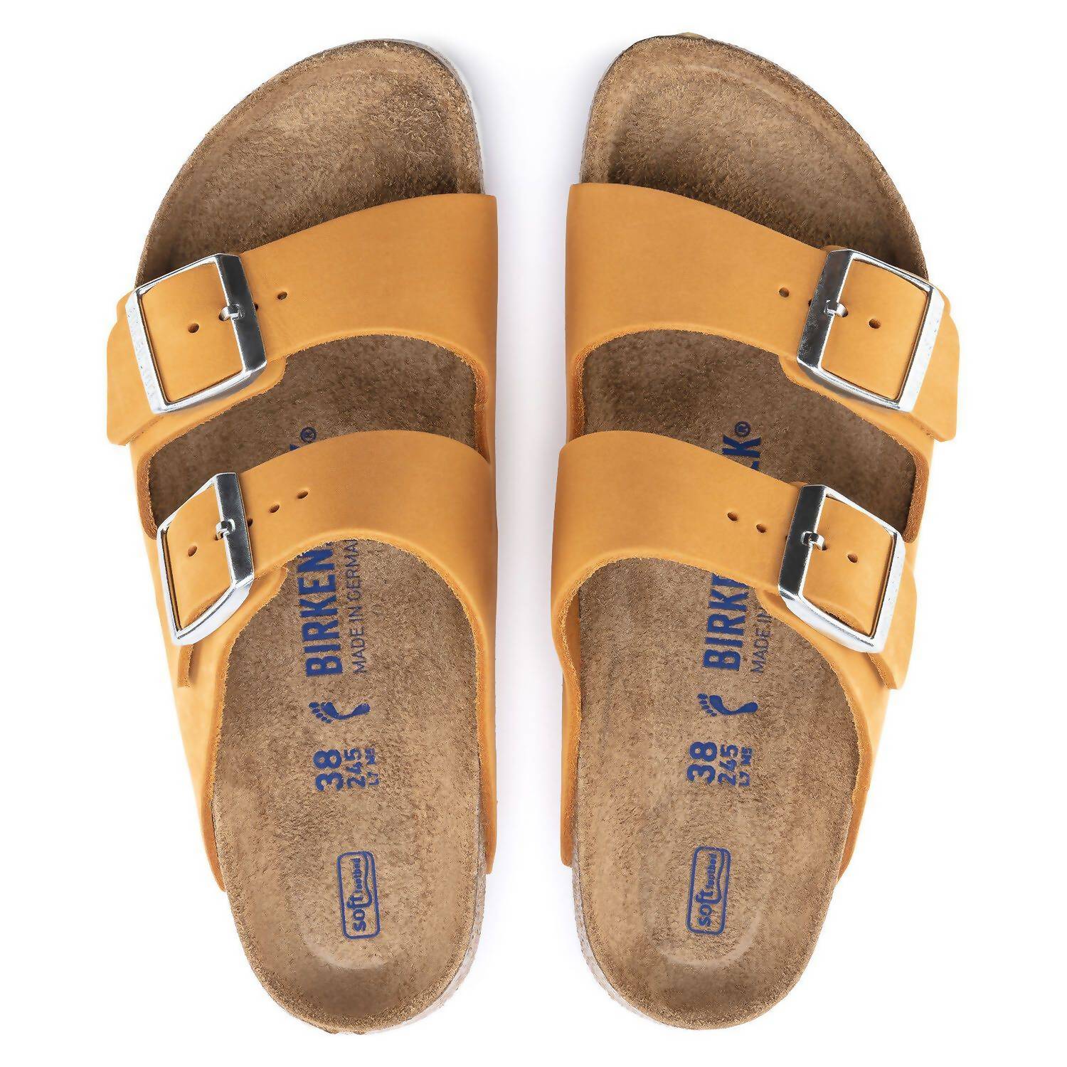 Classicly cute and all-day-wearable. We love this sandal. Step into comfort with the Women's Arizona Soft Footbed Sandals by BIRKENSTOCK, a stylish choice in delightful Apricot to enhance your summer wardrobe. These sandals feature a nubuck upper that offers a luxurious feel, while the real leather insole and cork footbed ensure lasting support and comfort. The EVA outsole provides added durability and shock absorption, making these sandals perfect for vacations or everyday wear. Designed with a flat heel and open toe, they're perfect for embracing the maximalist trend this season.