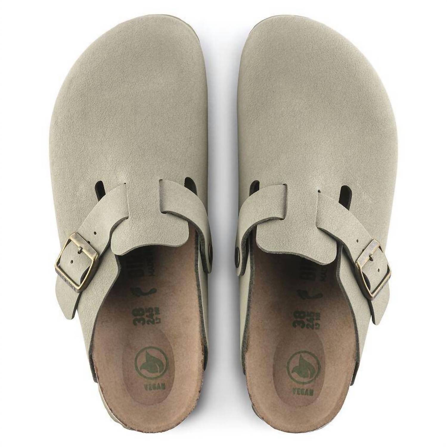 Slip them on and go! Introducing the Women's Boston Original Footbed Clog by BIRKENSTOCK, a khaki staple for casual elegance. Made in Germany, these clogs feature a vegan, skin-friendly Birkibuc upper and a contoured cork-latex footbed for exceptional comfort. The design includes a round toe and a flat heel, perfect for minimalist styles and dinner parties during the spring season. The clog's adaptable metal pin buckle and color-coordinated EVA sole enhance its sophisticated appeal.