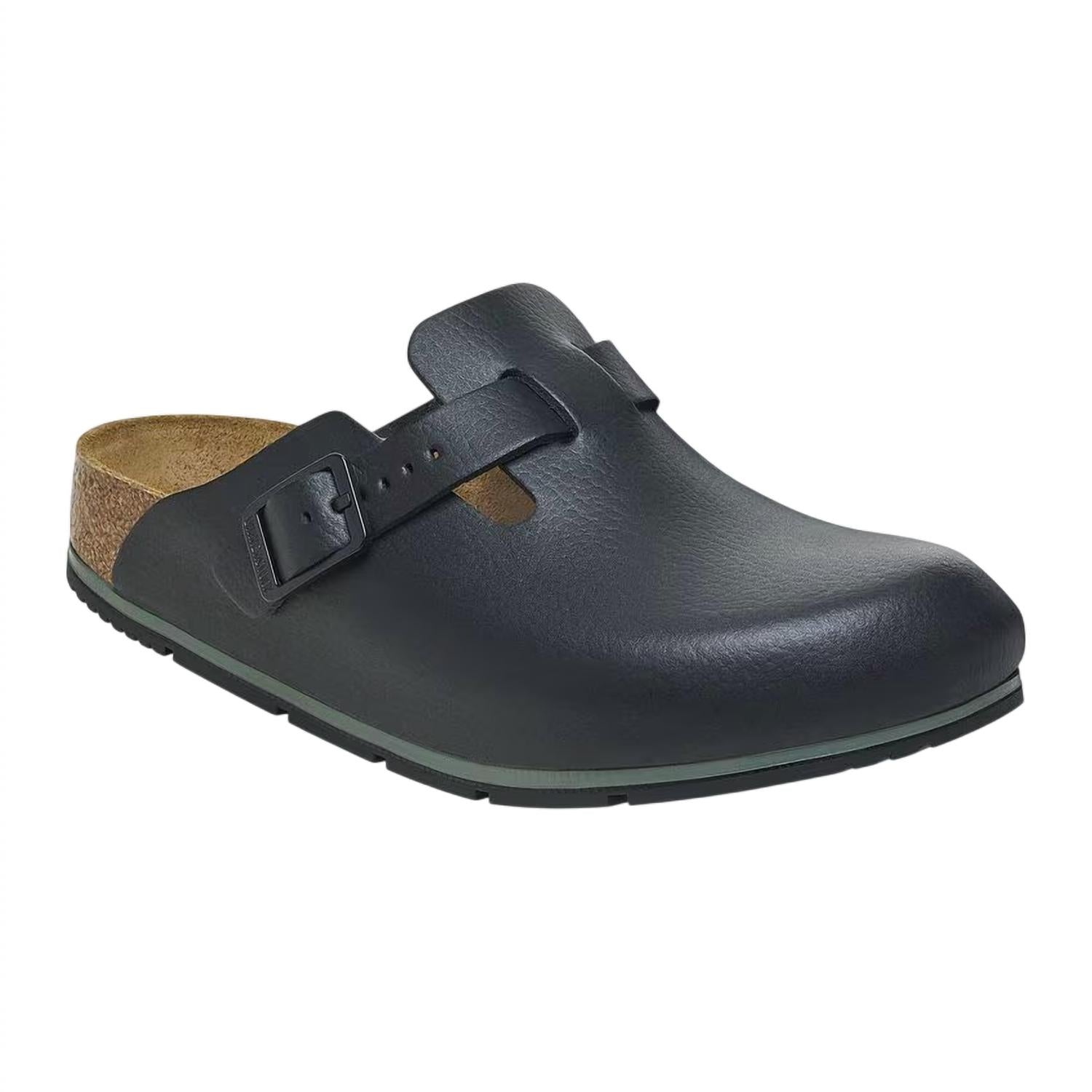 Slip them on and go! Featuring an adjustable strap with a metal pin buckle for a secure fit and crafted from fluid-resistant, PU-coated natural leather that adapts to your foot's shape while offering breathability and durability. The contoured cork-latex footbed provides custom support with wear, complemented by a cushioned PU midsole that absorbs shock. With a slip-resistant TPU outsole.