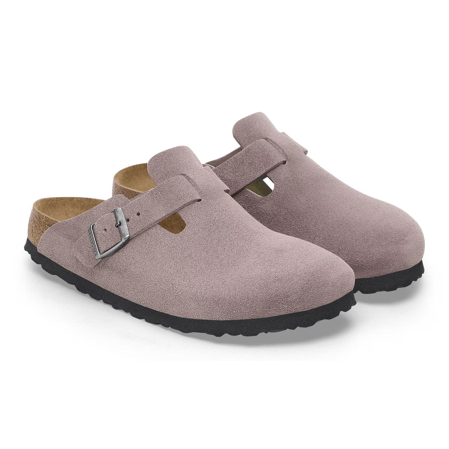 A trend that everyone is loving and this style might just be our favorite. Step into comfort with the Women's Boston Soft Footbed Suede Clogs by BIRKENSTOCK in a sophisticated Faded Purple hue. Featuring a suede upper for a luxurious feel, these clogs boast a single-strap design with an individually adjustable metal pin buckle for a customized fit. The shoe includes a suede footbed lining atop an anatomically shaped cork-latex footbed, complemented by an EVA outsole for lasting comfort and durability. These versatile mules are perfect for women seeking both style and support.