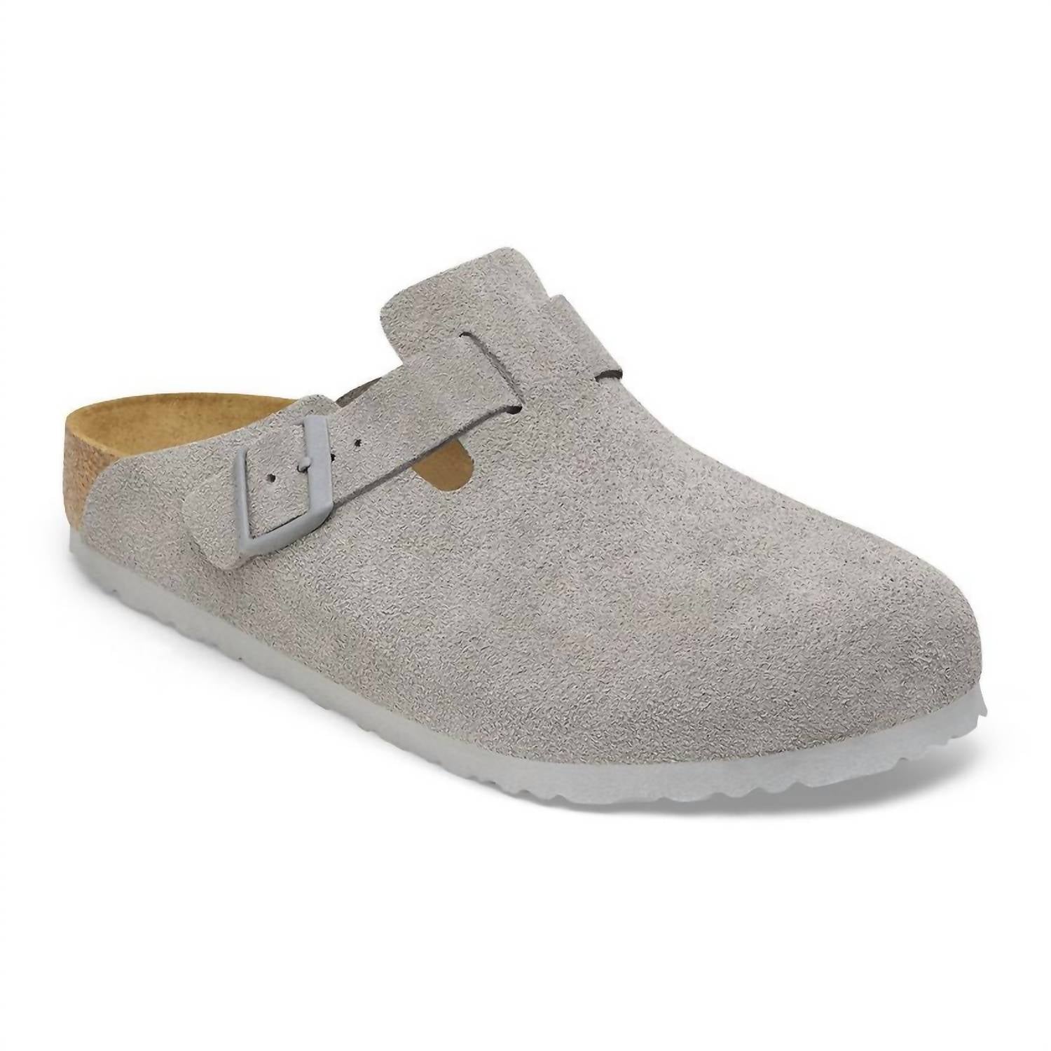 Slip them on and go! Step into effortless style and comfort with the Women's Boston Suede Leather Mules by BIRKENSTOCK in Stone Coin. Featuring a classic suede upper and an adjustable strap with a metal pin buckle, this clog is designed for ultimate versatility. It includes a contoured footbed with a printed microfiber lining and an EVA sole for lightweight flexibility. Originating from Germany, this minimalistic piece is perfect for summer travels.