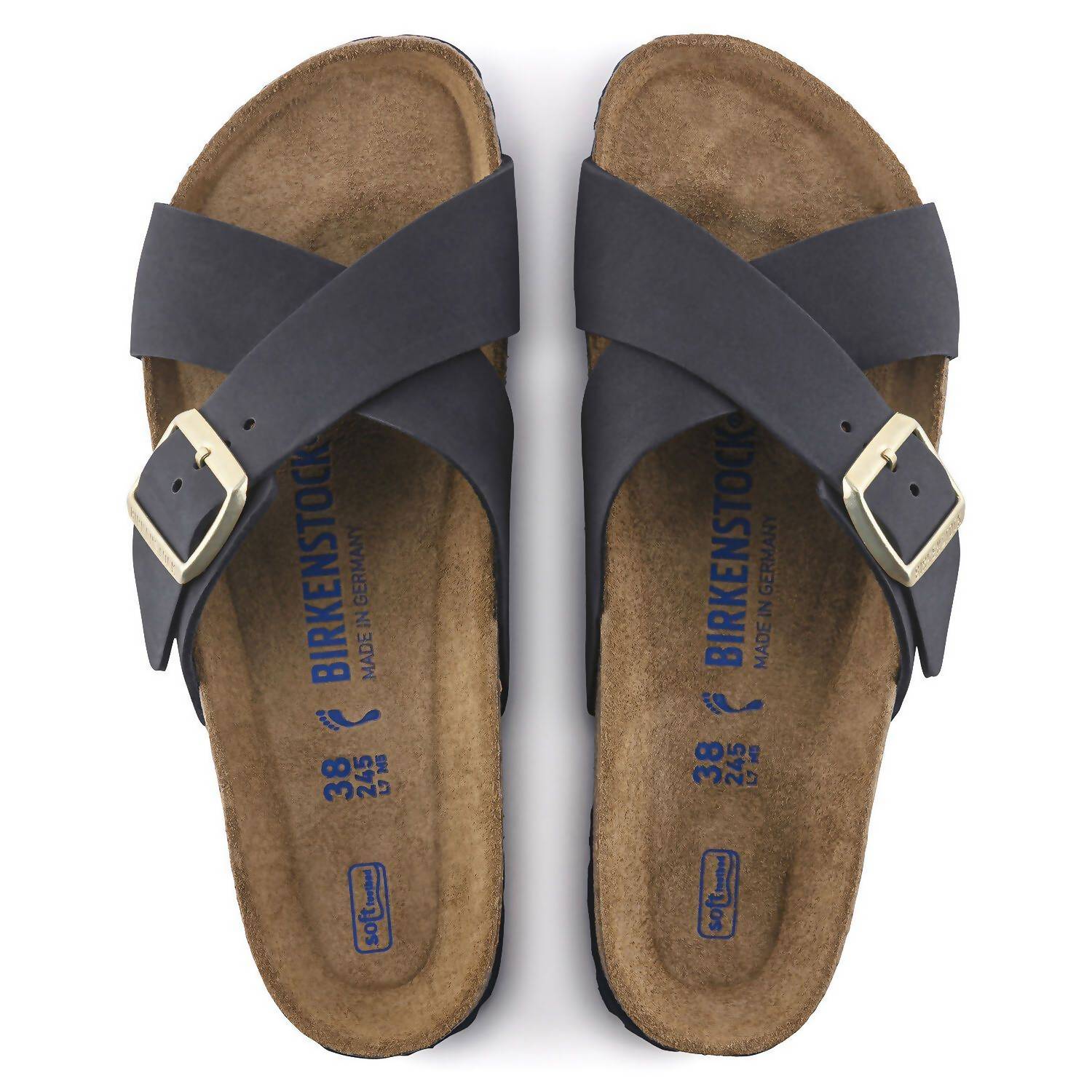 Classicly cute and all-day-wearable. We love this sandal. Introducing the BIRKENSTOCK Women's Siena Nubuck Sandals in Midnight, a perfect choice for a minimalist summer look. Crafted from high-quality nubuck leather, these sandals offer a refined, natural, and rustic appearance. The unique crossed straps and open toe design add a special touch, making these flats ideal for vacation wear. With a flat heel height of 1 inch and under, these sandals are designed for comfort without compromising on style.