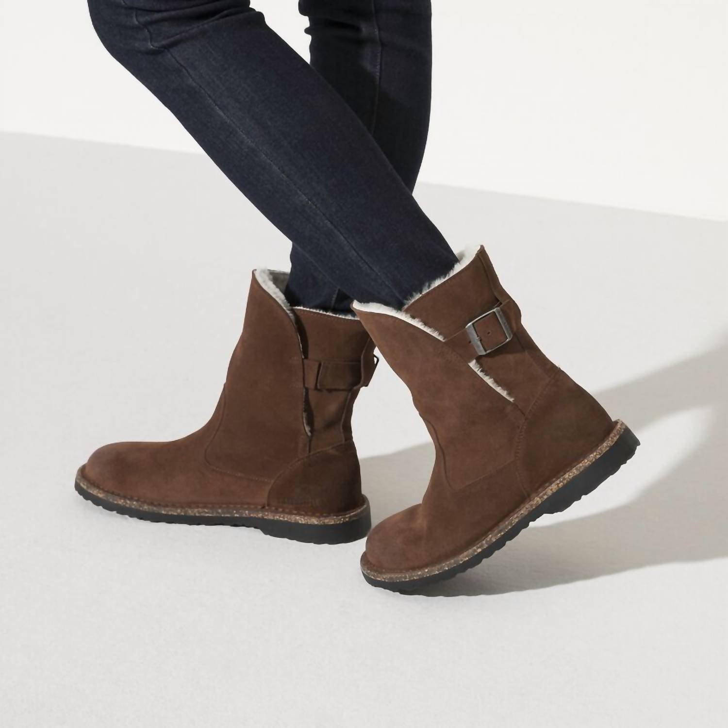 Say hello to the perfect, most versatile boot. The ankle height makes this style easily transition from day to night. Wear them with your favorite skinny jeans and tee for a more laid back look, or pair them with your favorite mini dress and jacket for a night out on the town. The Uppsala boot offers cozy comfort and versatile style, featuring a mid-high silhouette lined with genuine shearling for warmth. Crafted with a soft suede upper and smooth leather footbed lining, it includes a removable cork-latex footbed that molds to your foot for custom support. A durable TR rubber sole provides reliable grip, making this boot a stylish and practical choice for chilly days.