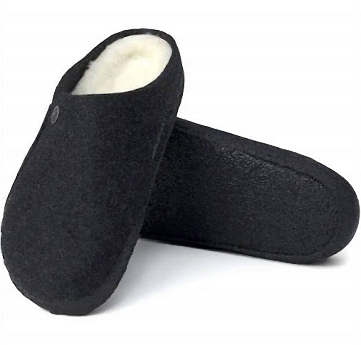 The BIRKENSTOCK Zermatt is our first true slipper. It features our iconic cork latex footbed, and to keep you extra cozy, it’s fully lined in genuine shearling that will keep your feet warm all winter long. The upper consists of soft genuine wool. Anatomically shaped cork/latex footbed lined with shearling Upper: wool felt Footbed lining: shearling Sole: latex Details: Decorative stitching