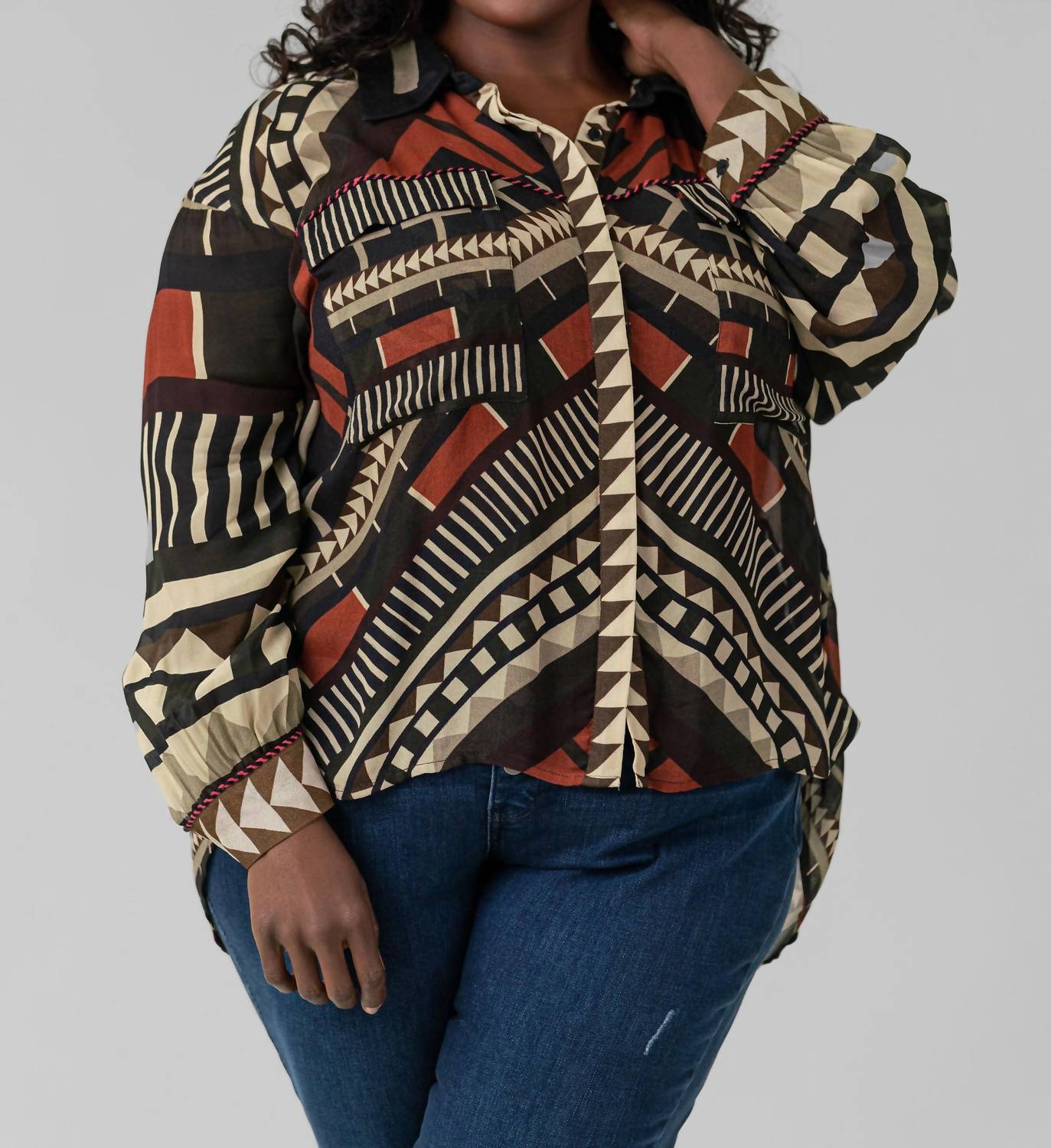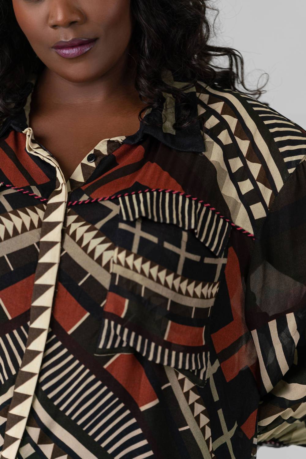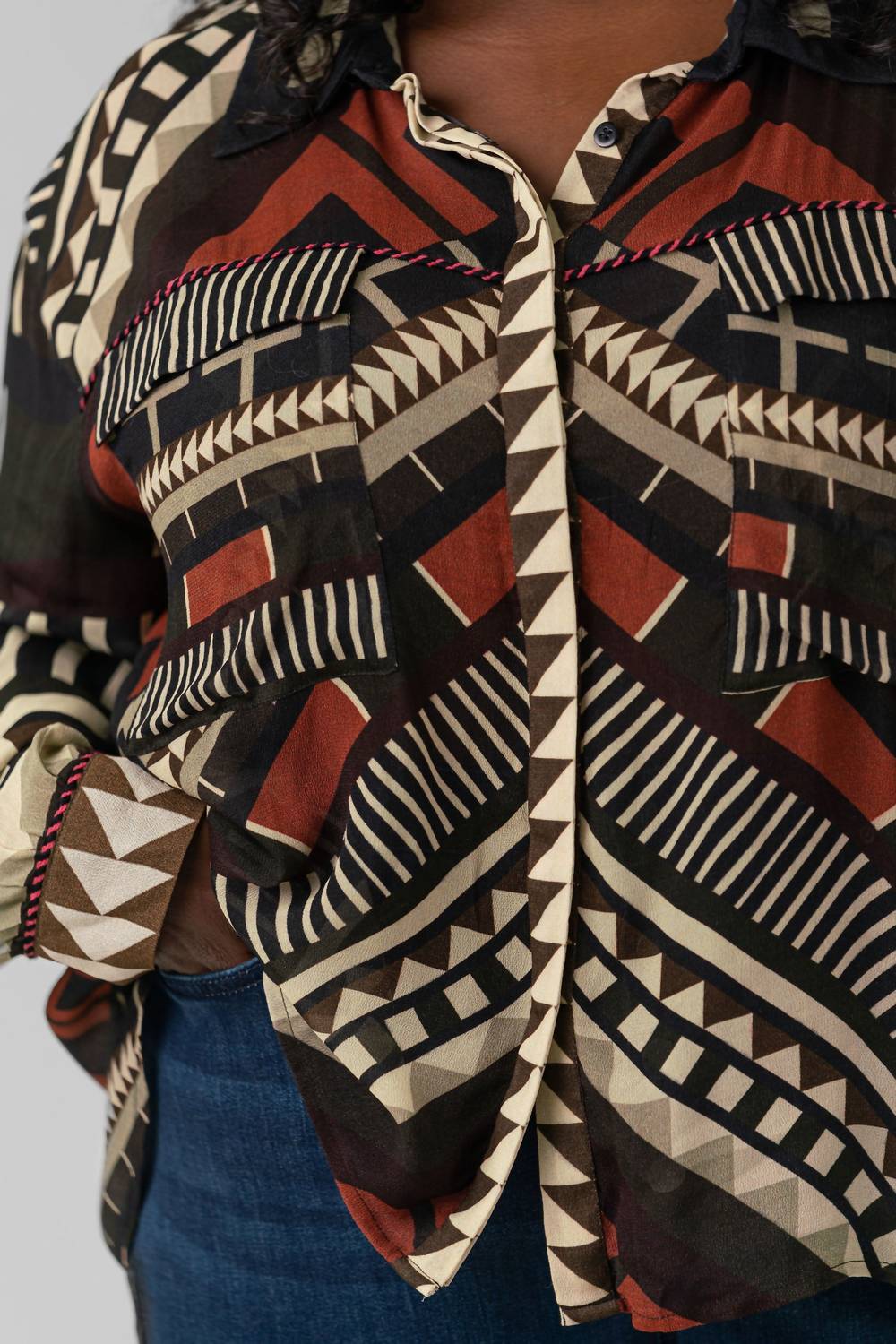 This button down shirt is comfortable yet polished. Introducing the Sanna Long Sleeve Shirt - Plus by -bl^nk-, a chic addition to any wardrobe with its Aztec print pattern. This stylish button down shirt features a collar neckline and is crafted from 40% Viscose, 60% Polyester, perfect for holidays or a workwear ensemble. With long sleeves and a convenient button closure, this patterned top is versatile for pairing with numerous wardrobe staples. Care instructions: Machine wash.