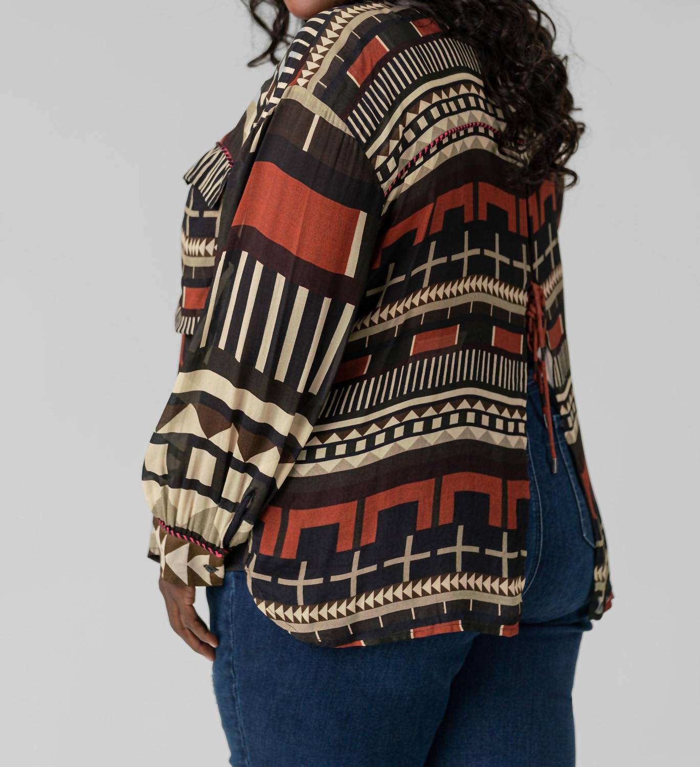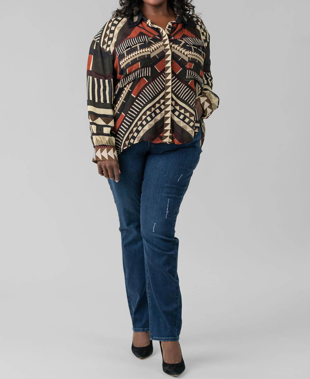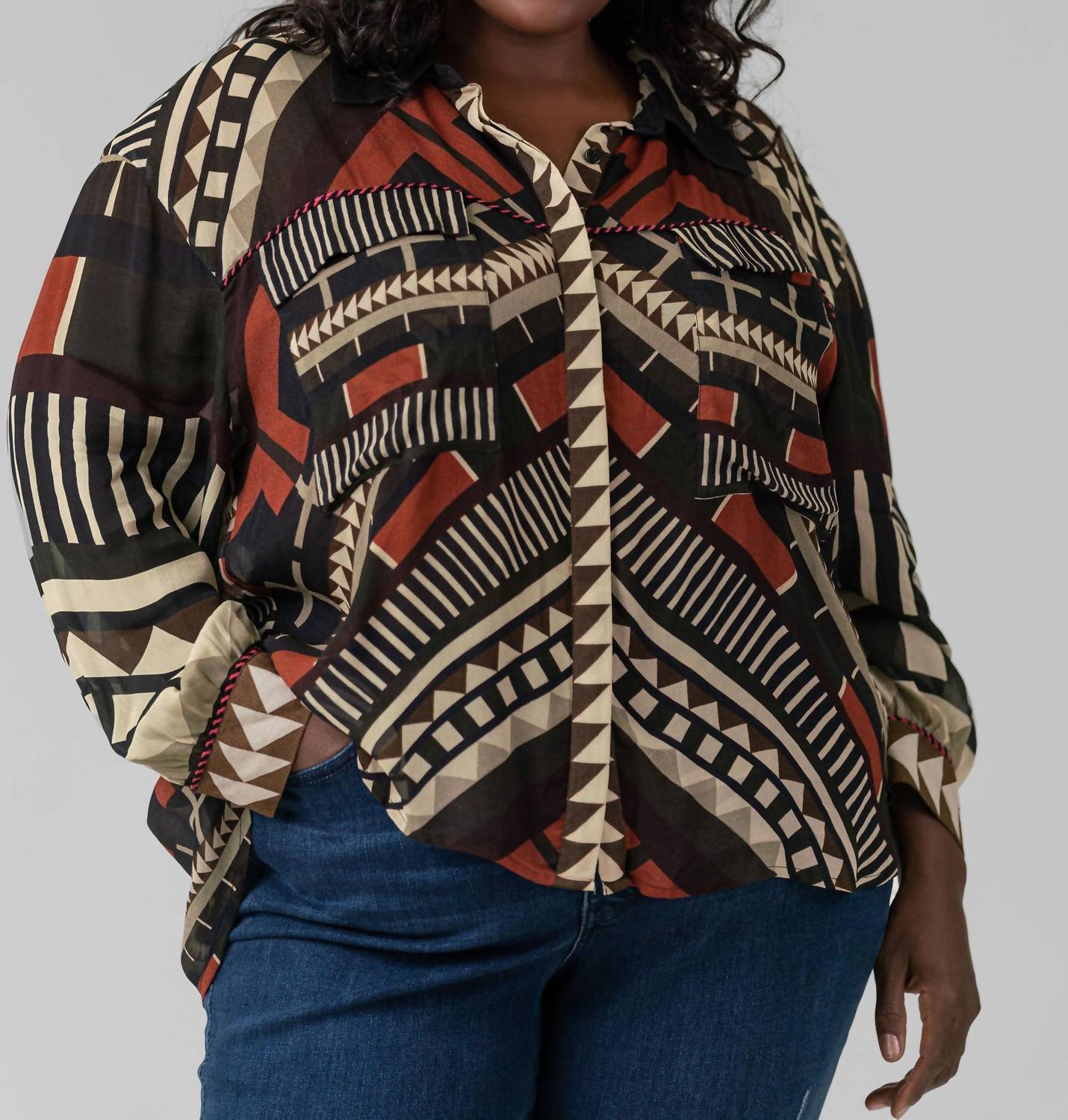 This button down shirt is comfortable yet polished. Introducing the Sanna Long Sleeve Shirt - Plus by -bl^nk-, a chic addition to any wardrobe with its Aztec print pattern. This stylish button down shirt features a collar neckline and is crafted from 40% Viscose, 60% Polyester, perfect for holidays or a workwear ensemble. With long sleeves and a convenient button closure, this patterned top is versatile for pairing with numerous wardrobe staples. Care instructions: Machine wash.