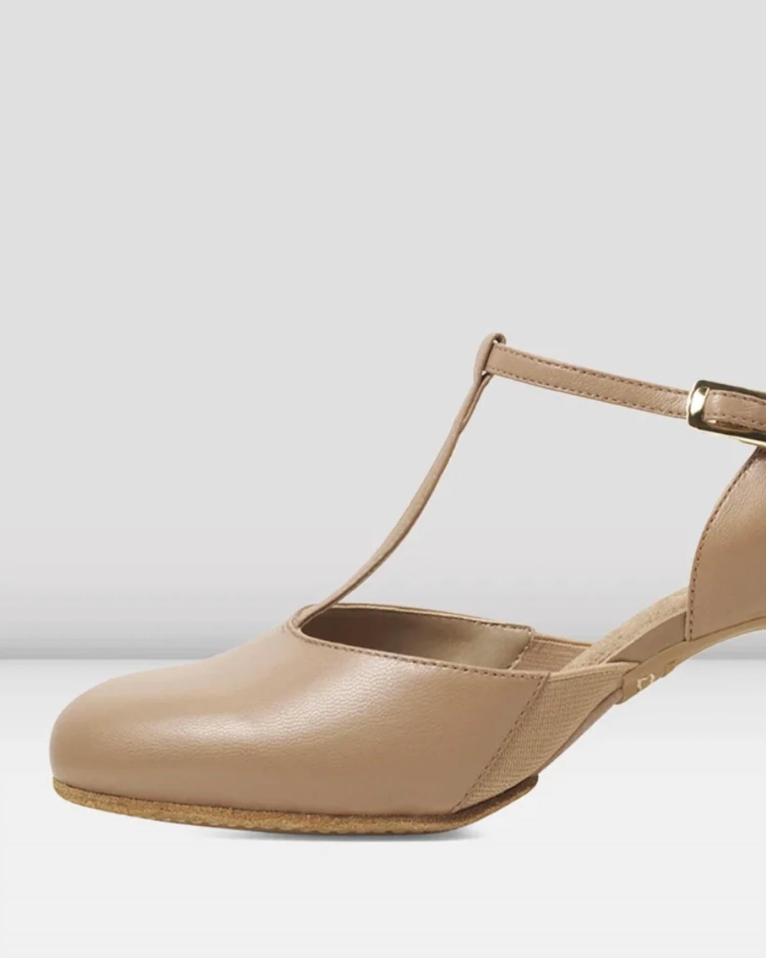 Introducing the Tan Leather Ladies Split Flex Character Shoe by Bloch, perfect for women engaging in character dance and interdisciplinary work. This shoe features a chic contoured 2.5-inch spool heel and a round toe design. The leather upper is complemented by a leather lining and a cushioned insole for added comfort. The ankle T-bar strap with a pin buckle and elastic allows for smooth foot movement, while the suede forefoot outsole facilitates turning and sliding.