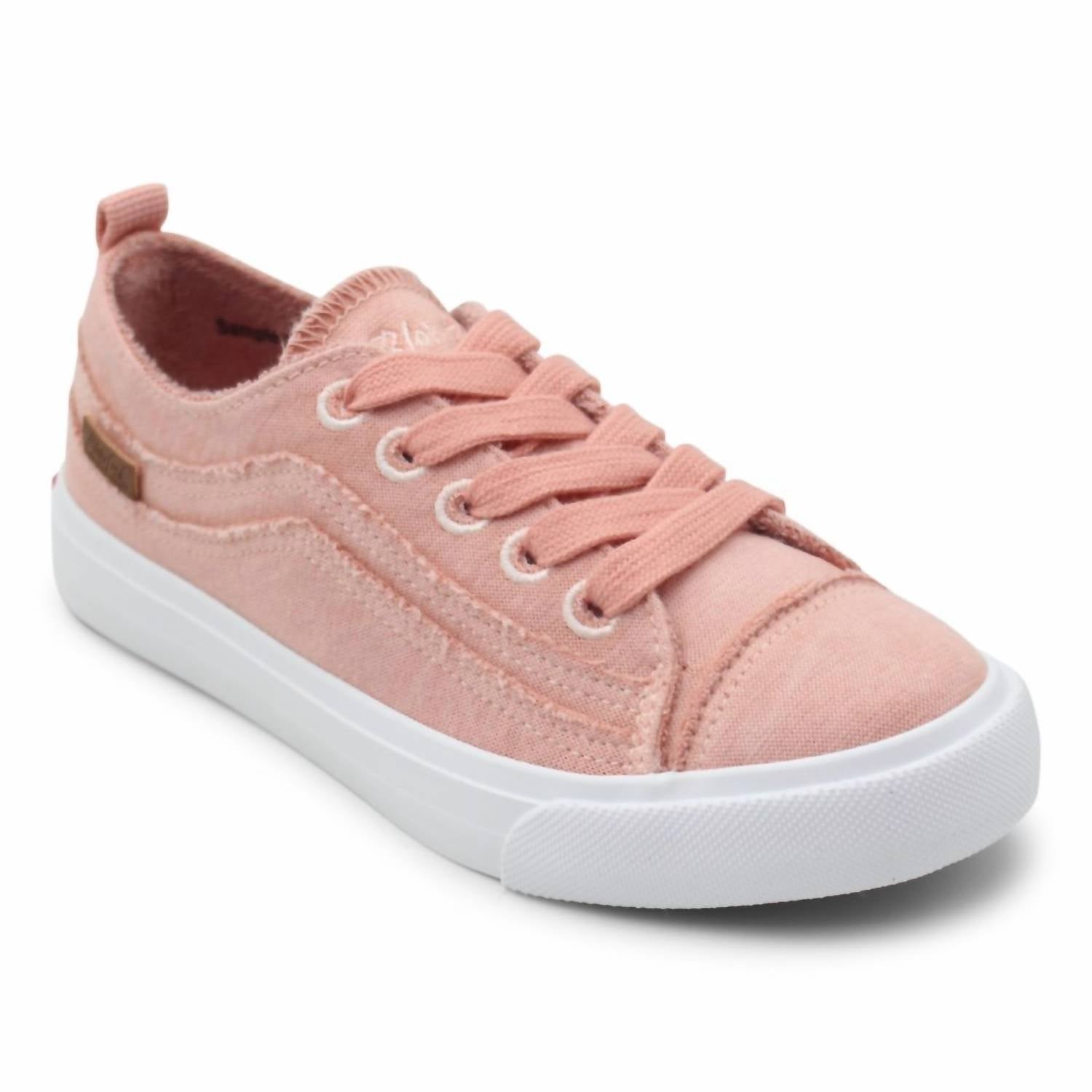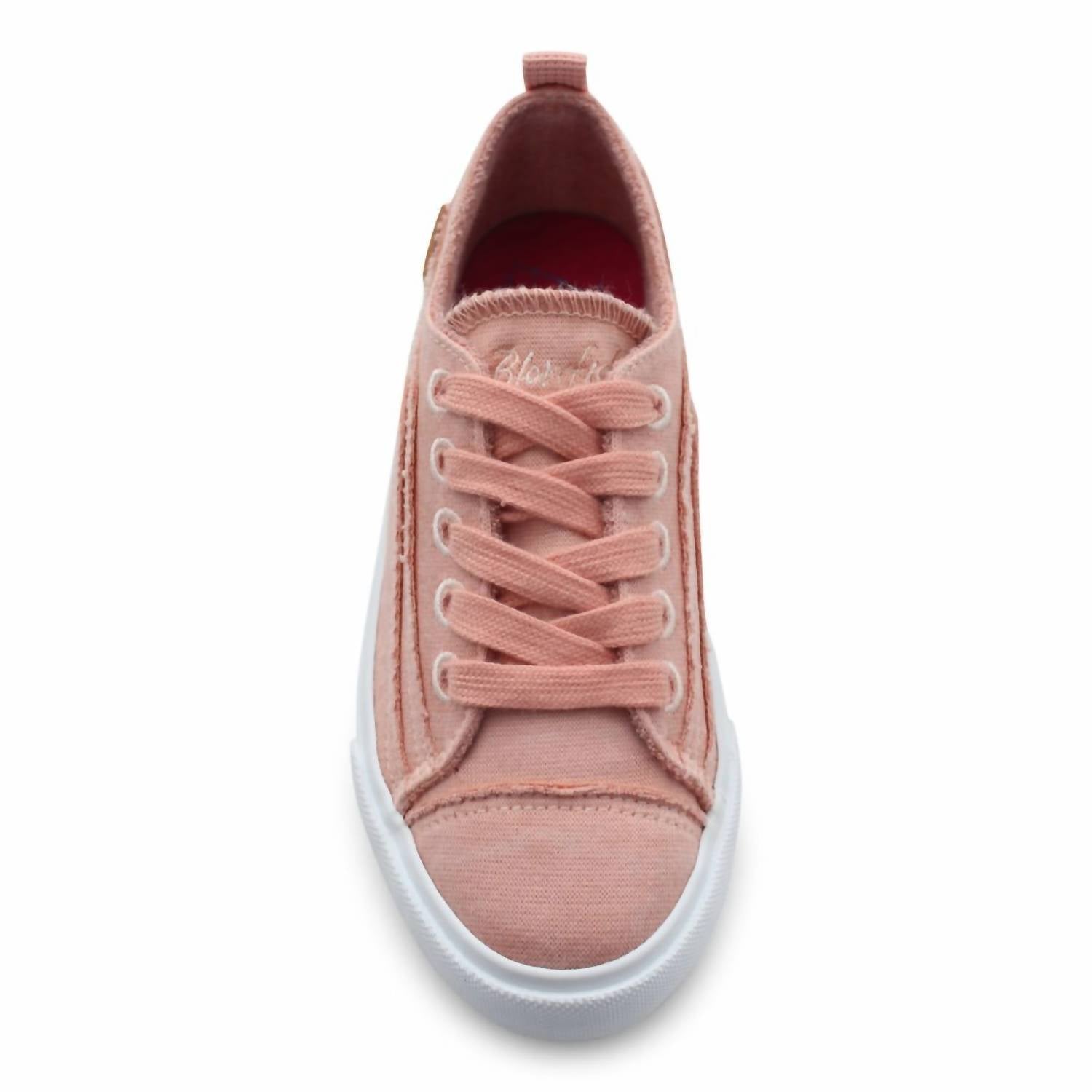 Introducing the Kids Metro-K Sneaker by BLOWFISH, designed for adventurous kids. Made from washed jersey canvas in a charming Sweet Shrimp color, these sneakers feature functional laces and embroidered eyelets for a fun and stylish look. The round toe design and cushioned footbed ensure all-day comfort, while the flat heel height enhances wearability. Enjoy these medium-width sneakers for a perfect fit and a touch of whimsy.