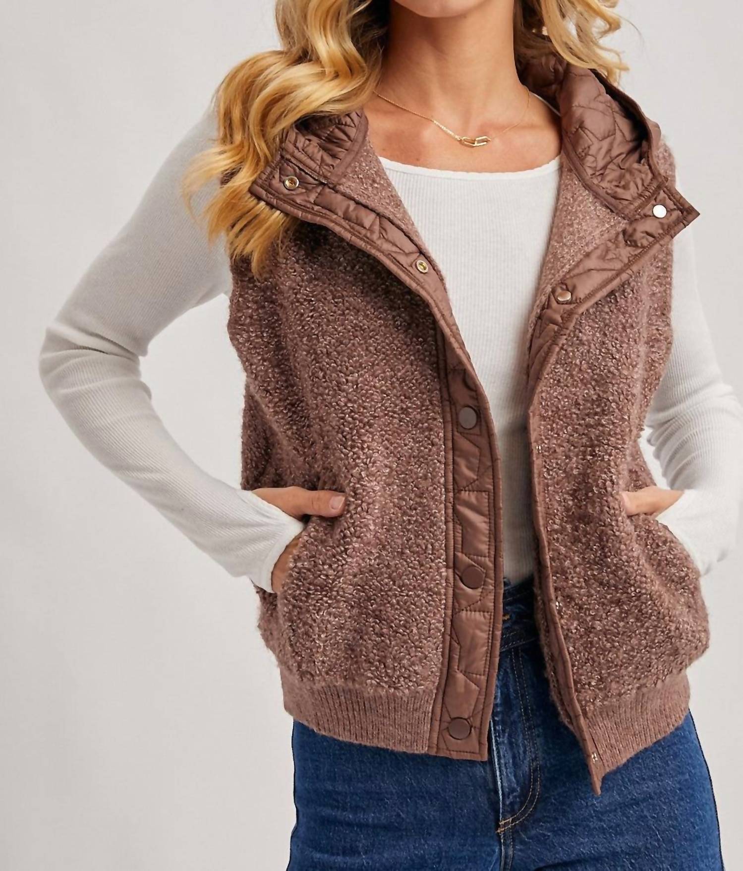A vest so versatile you can mix and match it with almost any outfit and it will feel brand new every time. Elevate your layering game with the BluIvy Button Down Sherpa Fleece Quilted Hood Vest in a versatile brown. This sleeveless, hooded vest is crafted from plush sherpa fleece, offering a textured aesthetic with a smooth diamond-quilted fabric on the attached hood. Featuring a snap closure and side welt pockets, this vest ensures functionality meets style. It's the perfect piece for a minimalist, fall-ready look, and is ideal for travel occasions. Model is 5'9" and wearing a Small.