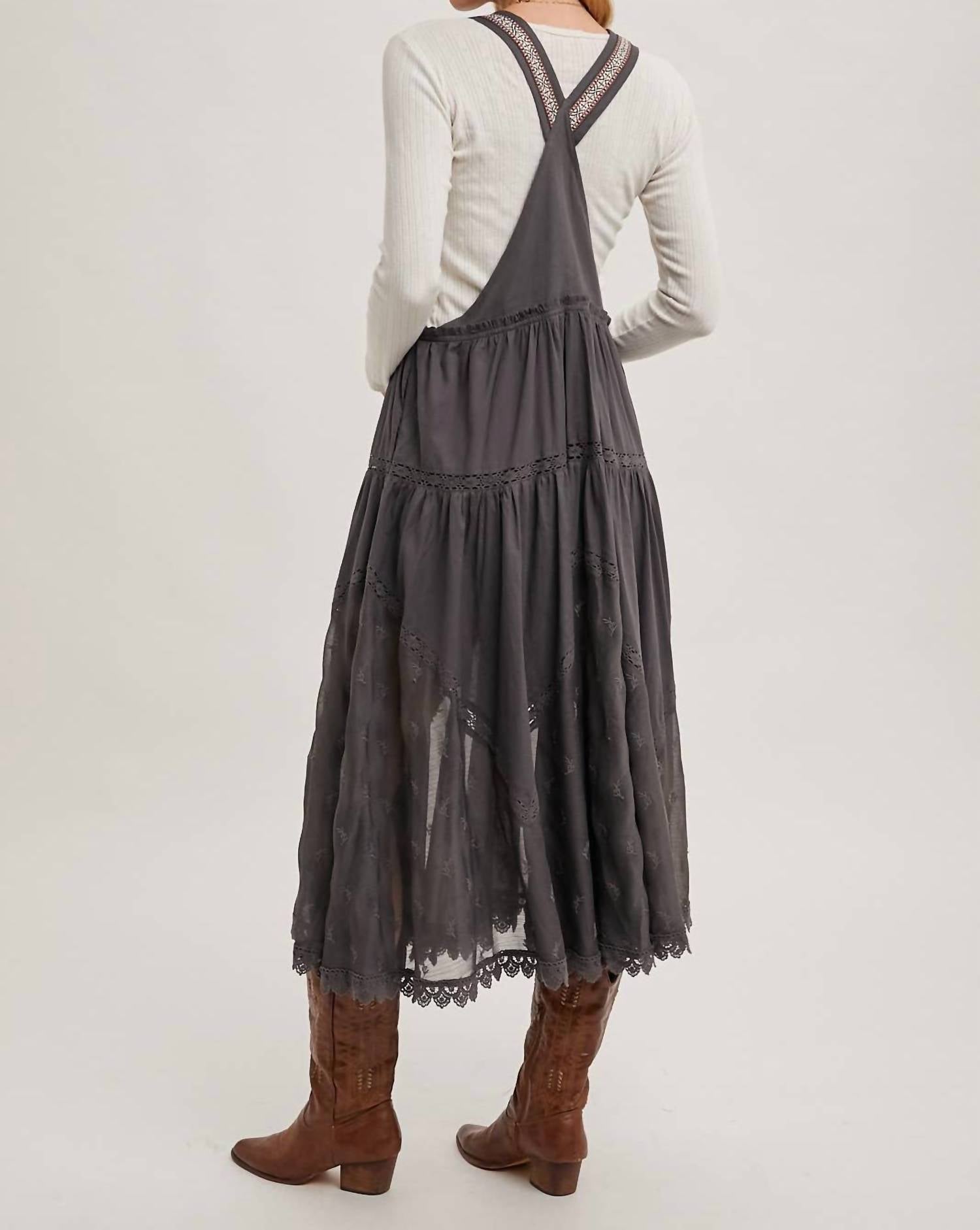 Who doesn't love a good maxi dress? This one you'll be reaching for season after season. The Lucy Lace Embroidered Tulle Bib Maxi Dress by BluIvy is an enchanting statement piece in an ash hue, perfect for any wardrobe. This sleeveless dress is crafted from textured tulle and features adjustable straps for a personalized fit, emphasizing a squareneck and embroidered bib for a feminine touch. With a graceful A-line silhouette and practical pockets, it effortlessly blends whimsical style with everyday functionality. Closure: Hook and eye closure. Ideal for a boho chic vibe during fall vacations, it can be paired with sandals for a relaxed look or dressed up with heels and accessories for special occasions.