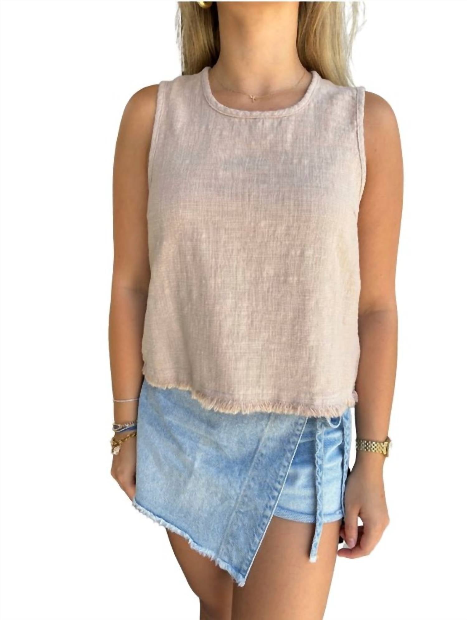 Fit, fabric and functionality. This tank top checks all the boxes. Introducing the Shell Sleeveless Tank Top by bobi, a must-have for your summer wardrobe in a versatile Sandy hue. Crafted from 100% cotton, this tank offers a breathable, lightweight feel with a woven slub texture, making it perfect for vacation or holiday wear. With a 21" body length, scoopneck, and easy pull-on closure, it integrates effortlessly into any casual look. Ideal for fans of 90s fashion, this tank is a simple yet stylish staple.