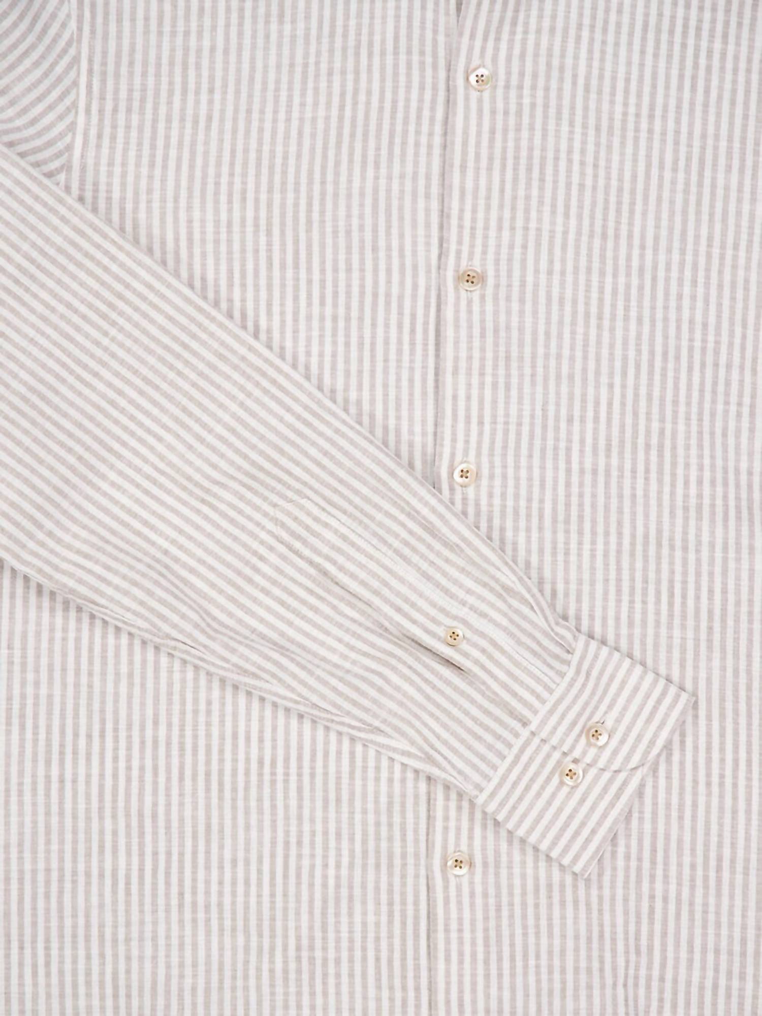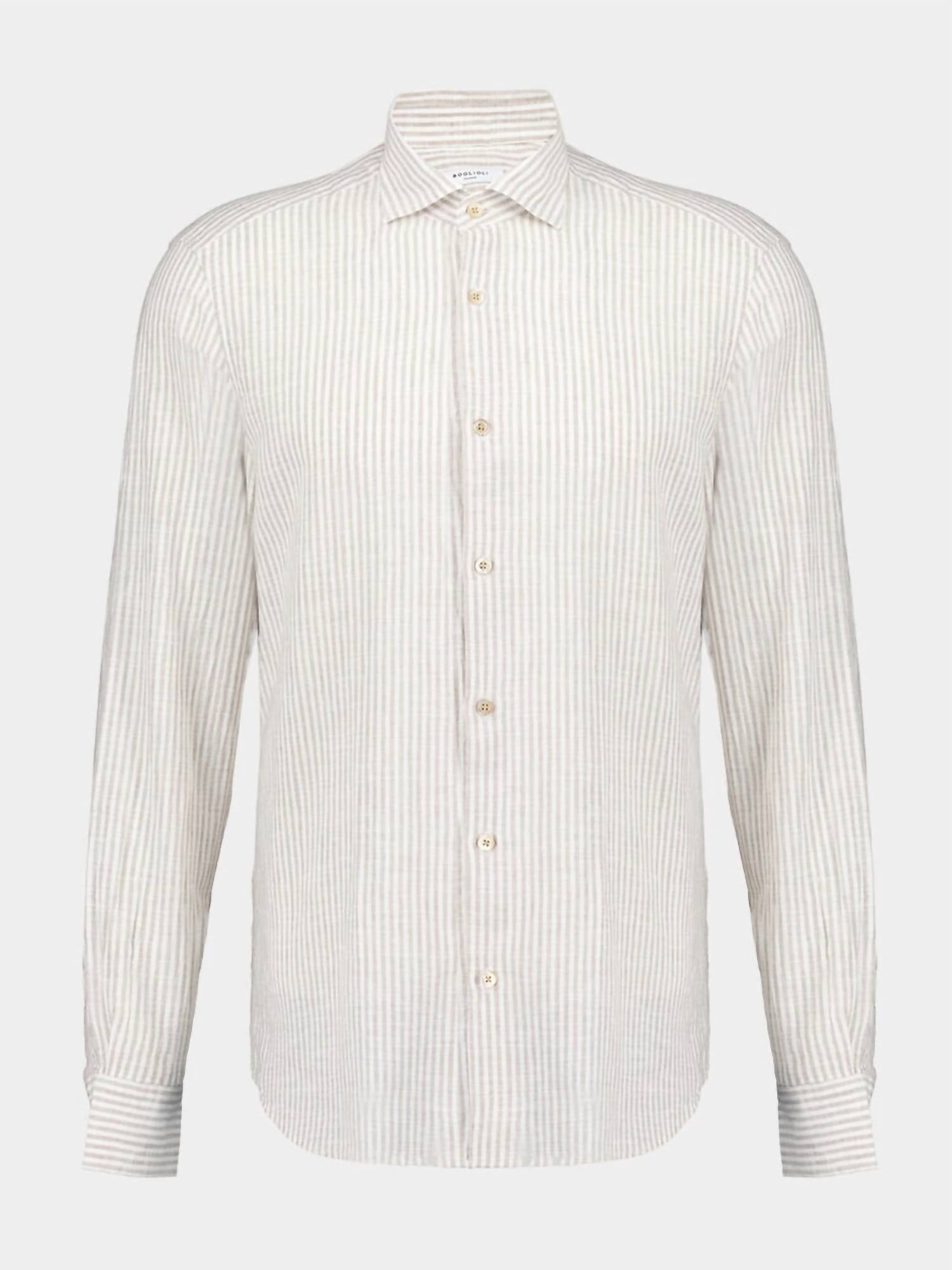 Presenting the Men's Striped Cotton-Linen Shirt by Boglioli, a perfect blend of style and comfort. This long sleeve shirt is crafted from 70% cotton and 30% linen, offering breathability and a soft touch. Made in Italy, it features a classic collar and a sophisticated button closure, embodying a timeless silhouette suitable for multiple occasions. Care for this piece with a simple machine wash to maintain its pristine condition.