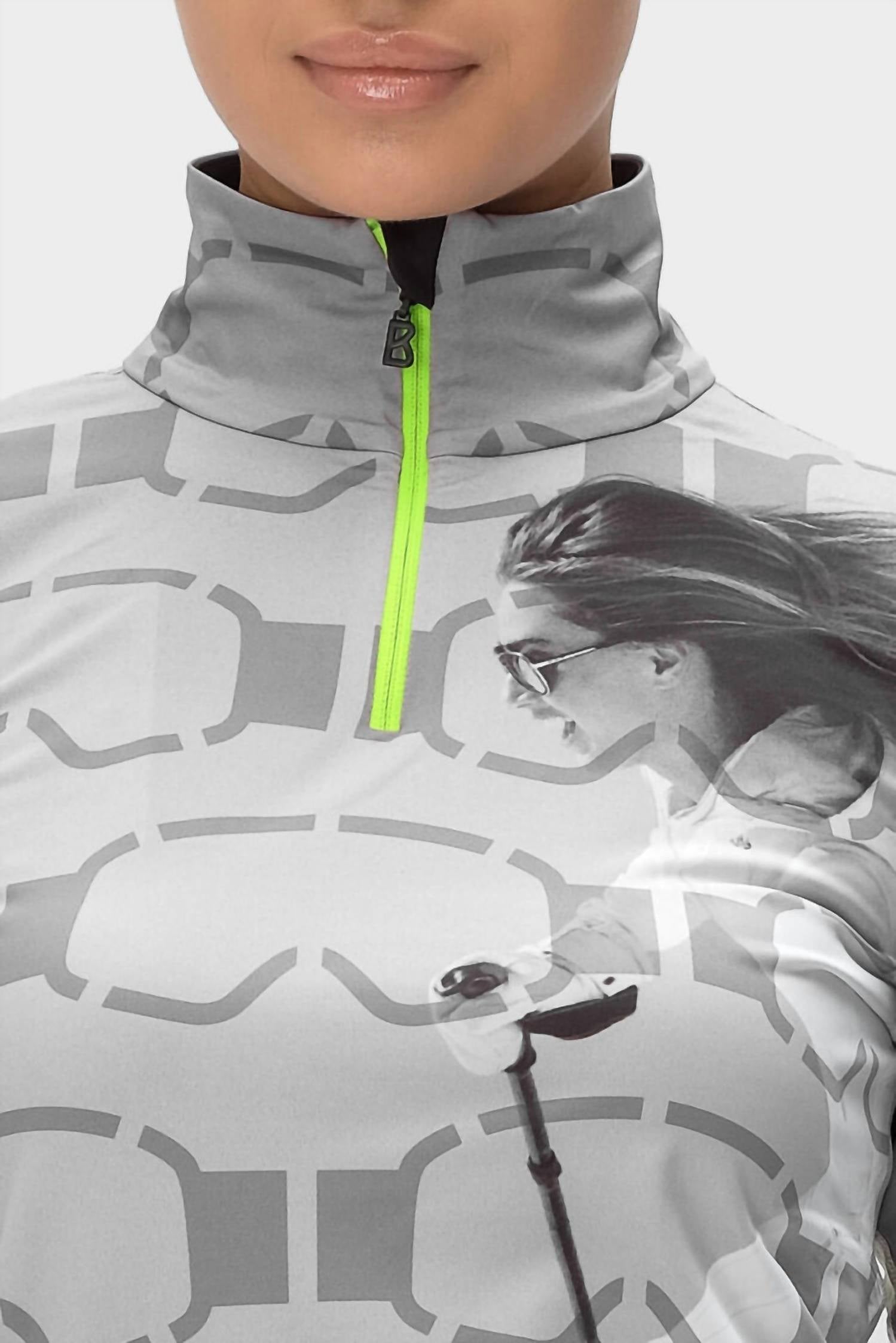 Experience the Ilvy3 First Layer Shirt by BOGNER, a stylish addition to your activewear collection. This long sleeve tee in a modern grey hue features power stretch fabric for a comfortable fit and a stand-up turtleneck collar with a short zip. Crafted in Germany with a durable blend of 81% polyester and 19% elastane, it showcases a distinctive photo print and shaping overlock seams. Elevate your athleisure look while enjoying freedom of movement and moisture-wicking benefits.