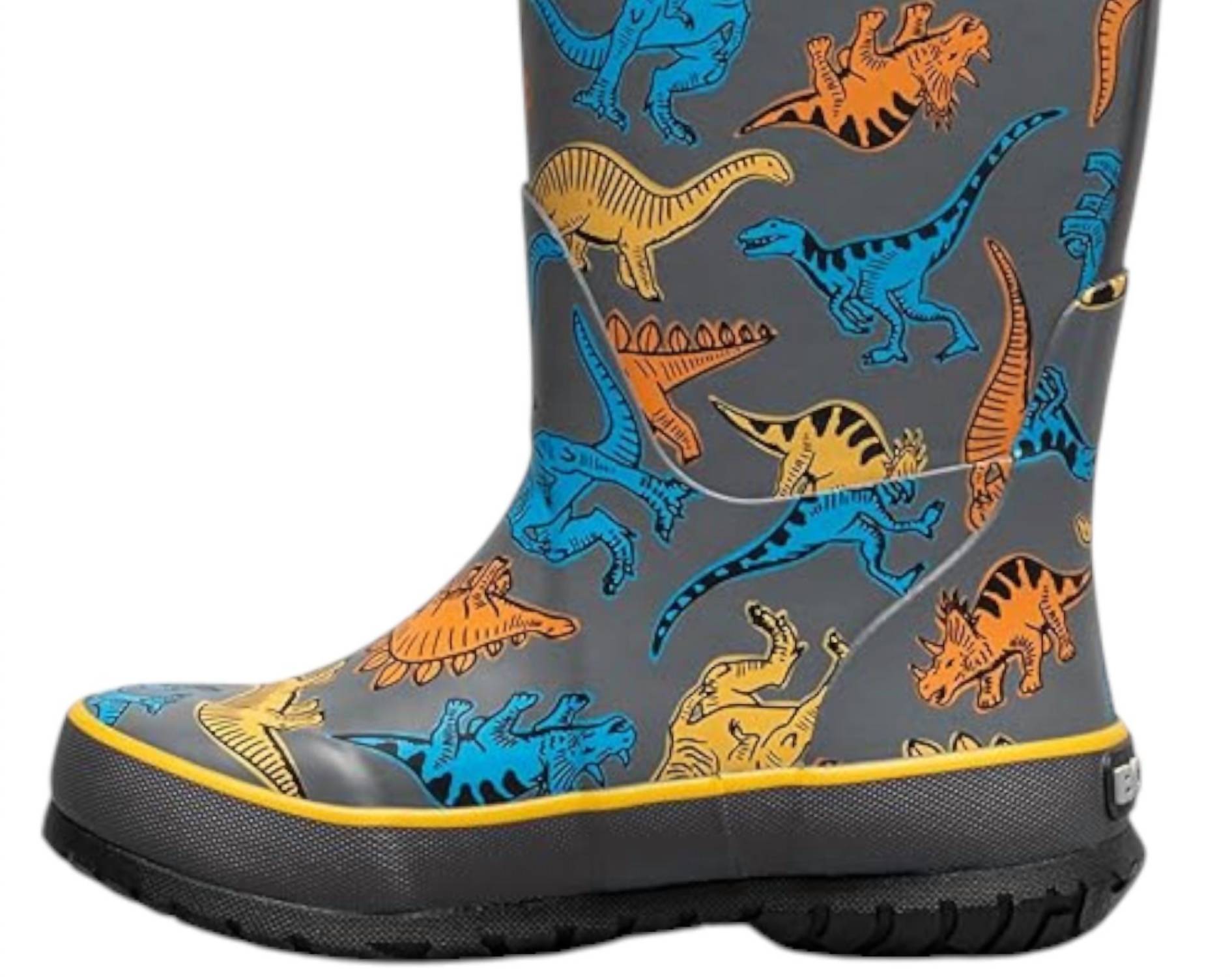 Introducing the Boy's Dino Rain Boots by BOGS, perfect for adventurous toddlers who love a splashy playtime. These gray boots feature a cheerful dinosaur print and are crafted from 100% natural rubber, ensuring feet stay dry and comfortable. Designed with a flat heel and a round toe shape, they prioritize both comfort and style during rainy days. To maintain their quality, simply clean with cold water and mild soap, avoiding harsh solvents.