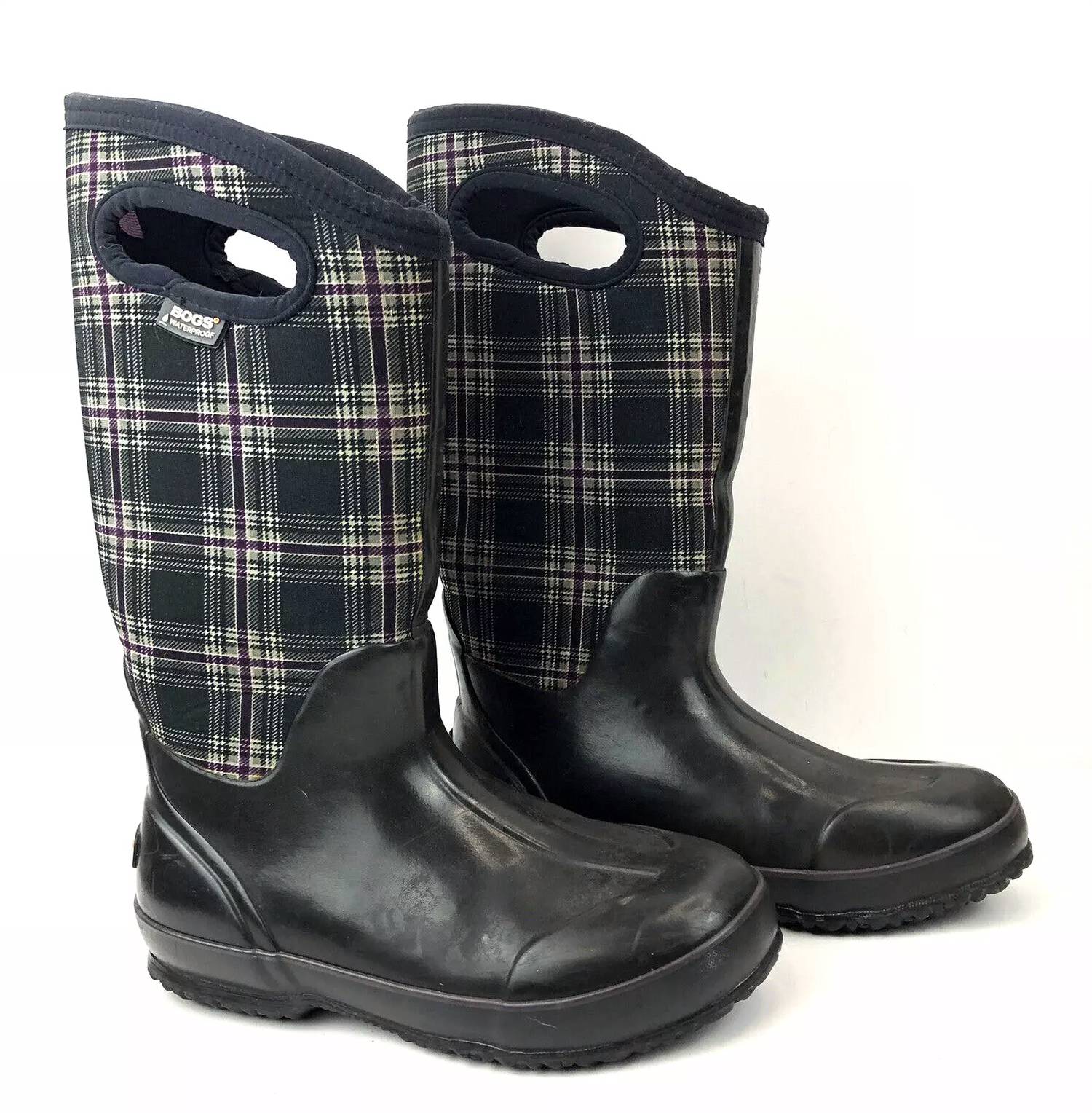 You'll be wishing for rainy days with these stylish yet functional rainboots. Introducing the Women's Classic High Winter Boot by BOGS, designed to keep you warm and cozy during harsh weather conditions. This plaid details boot features a 12.75" tall shaft with an almond toe shape, asymmetric opening, and a 15.5" circumference for a snug fit. It's crafted from 70% Neoprene and 30% Natural Rubber, with Neo-tech 5mm insulation and DuraFresh, Max-wick lining, ensuring waterproof comfort. With a 1/2" stacked heel and convenient pull-on handles and tab, it's perfect for easy wear.