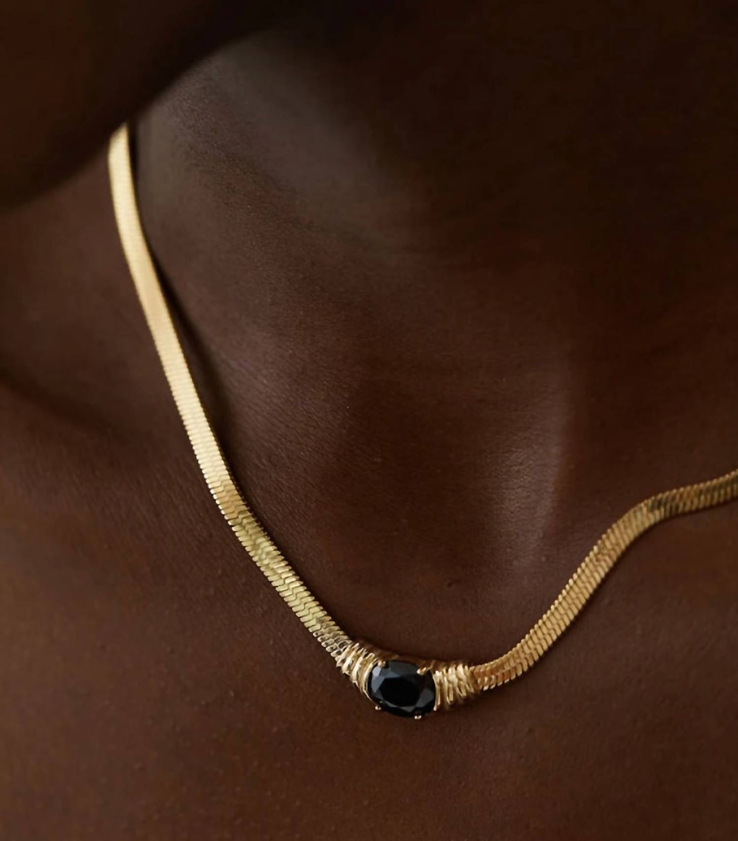 Layer this necklace or wear it on its own. Either way it's a win-win. Add a touch of sophistication to any outfit with the Women's Diana Necklace by BRACHA, a regal piece in Onyx. This timeless classic features a sleek herringbone design with a simulated diamond accent, elegantly combining vintage charm with modern allure. Material: Gold plated over stainless steel. Closure: Lobster clasp. Enjoy the added convenience of a 17" chain with a 2" extender. This necklace is both water resistant and tarnish resistant, ensuring durability and longevity.