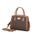 Discover the Brangio Italy Classic Charm Floral Print Satchel Bag, an exquisite accessory in Black Gold for the discerning woman. Crafted with durable, eco-friendly vegan leather featuring elegant floral prints and golden trims, this satchel is designed for elegance and practicality. It offers a spacious interior with multiple compartments and a detachable, adjustable strap for versatile styling. Dimensions are L: 13”, H: 10”, W: 6”, HD: 5”, and it secures with a reliable zip closure.