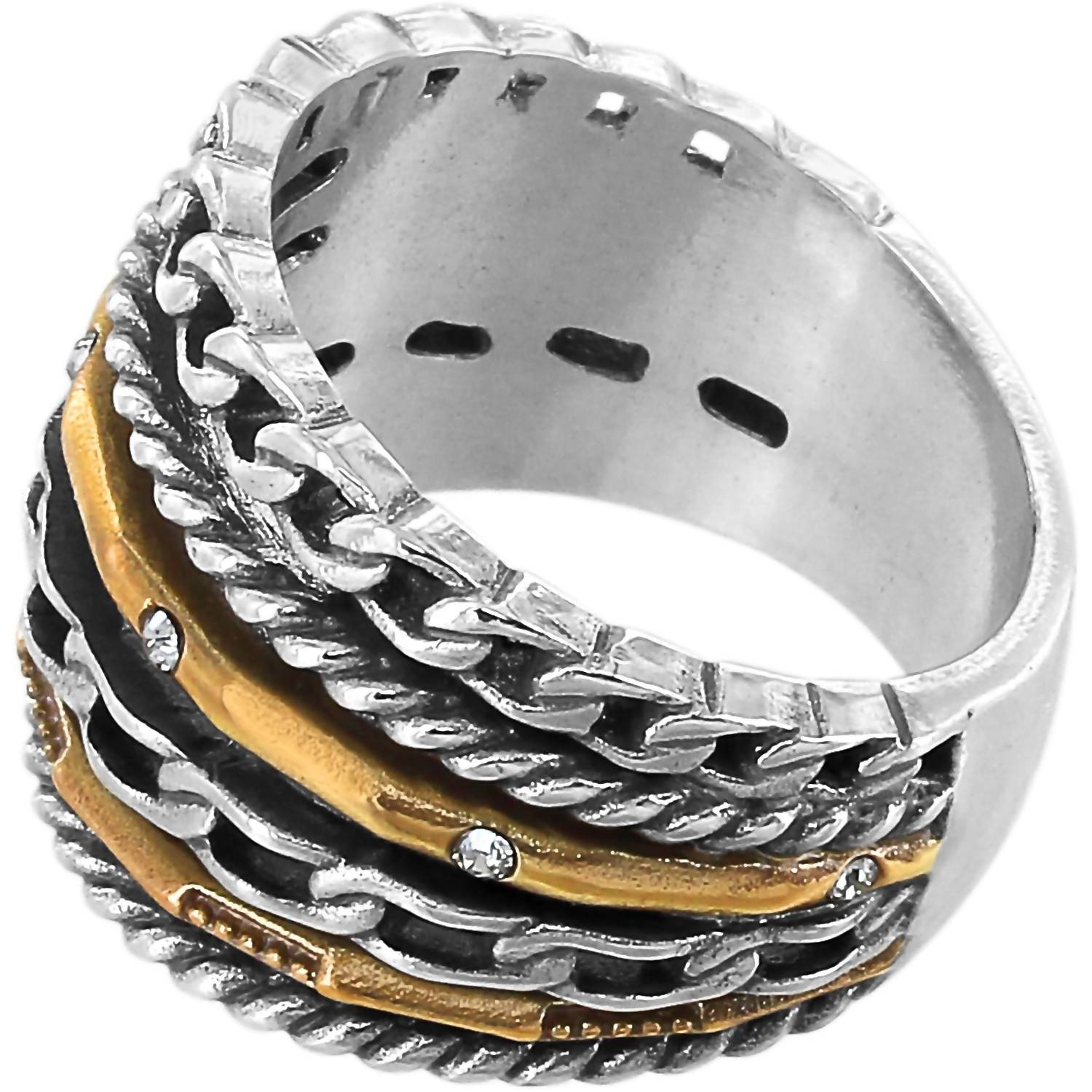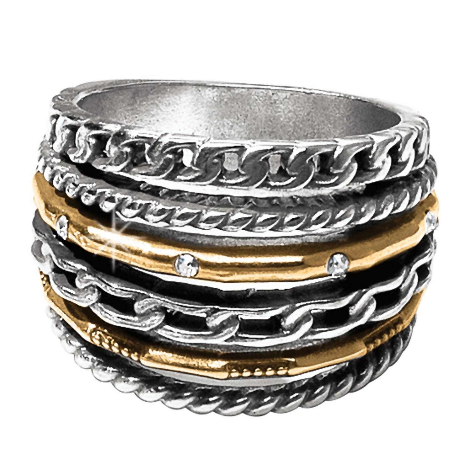 Wear this ring stacked or by itself... you can't go wrong. Discover the captivating allure of Brighton's Neptune's Multiple Row Ring, a fine jewelry piece inspired by the enigmatic planet. This stacked ring boasts a stunning two-tone finish in silver-gold, crafted from fine quality crystal with silver plating. Dimensions: 5/8" in width and 1/8" in height. A unique and elegant addition to your collection.