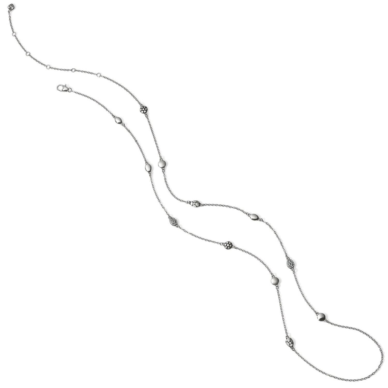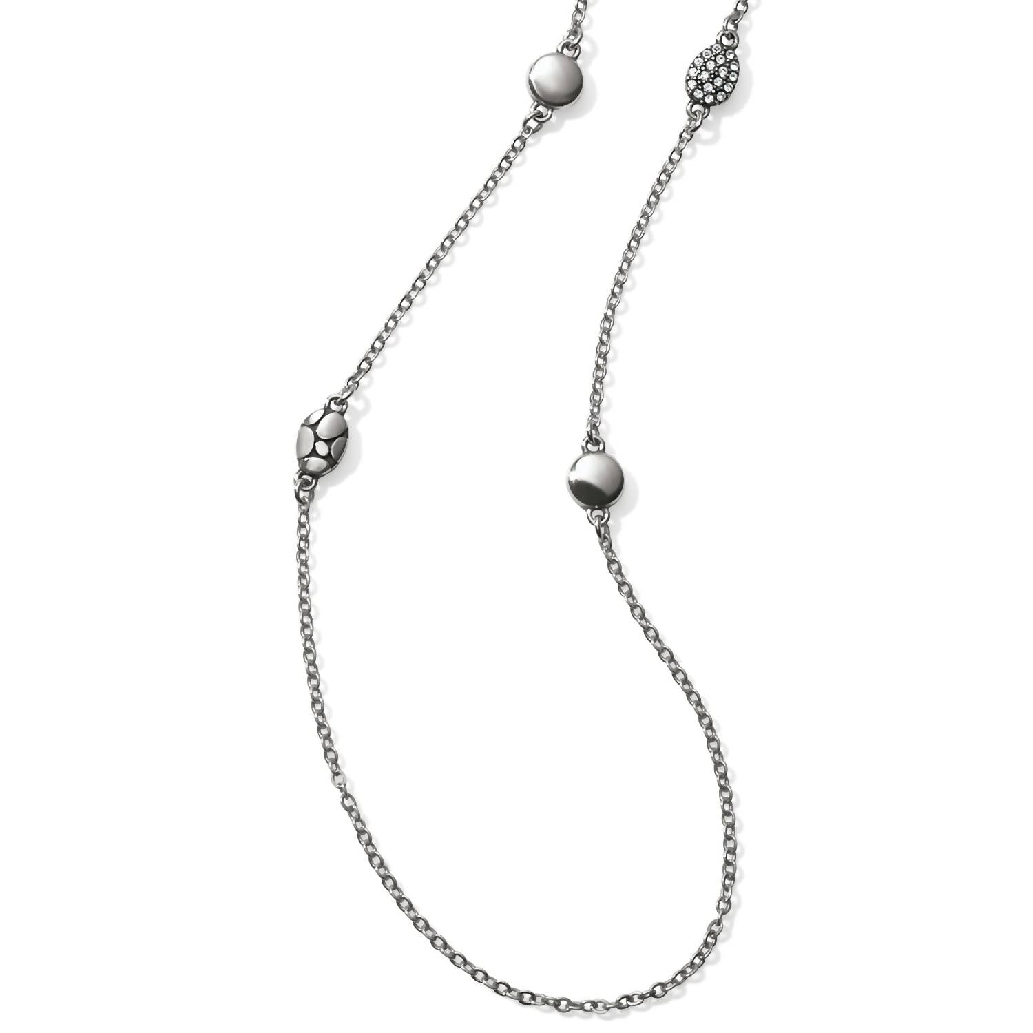 Both understated and impactful, you'll be reaching for this one-of-a-kind necklace season after season. Embrace elegance with the Brighton Woman's Pebble Mix Long Necklace, featuring a harmonious blend of silver pebble disc shapes and smooth silver discs. This delicate chain takes inspiration from traditional Balinese dot jewelry, creating a timeless piece perfect for any occasion. Crafted in a striking silver hue, this necklace is a must-have for those who appreciate intricate design.