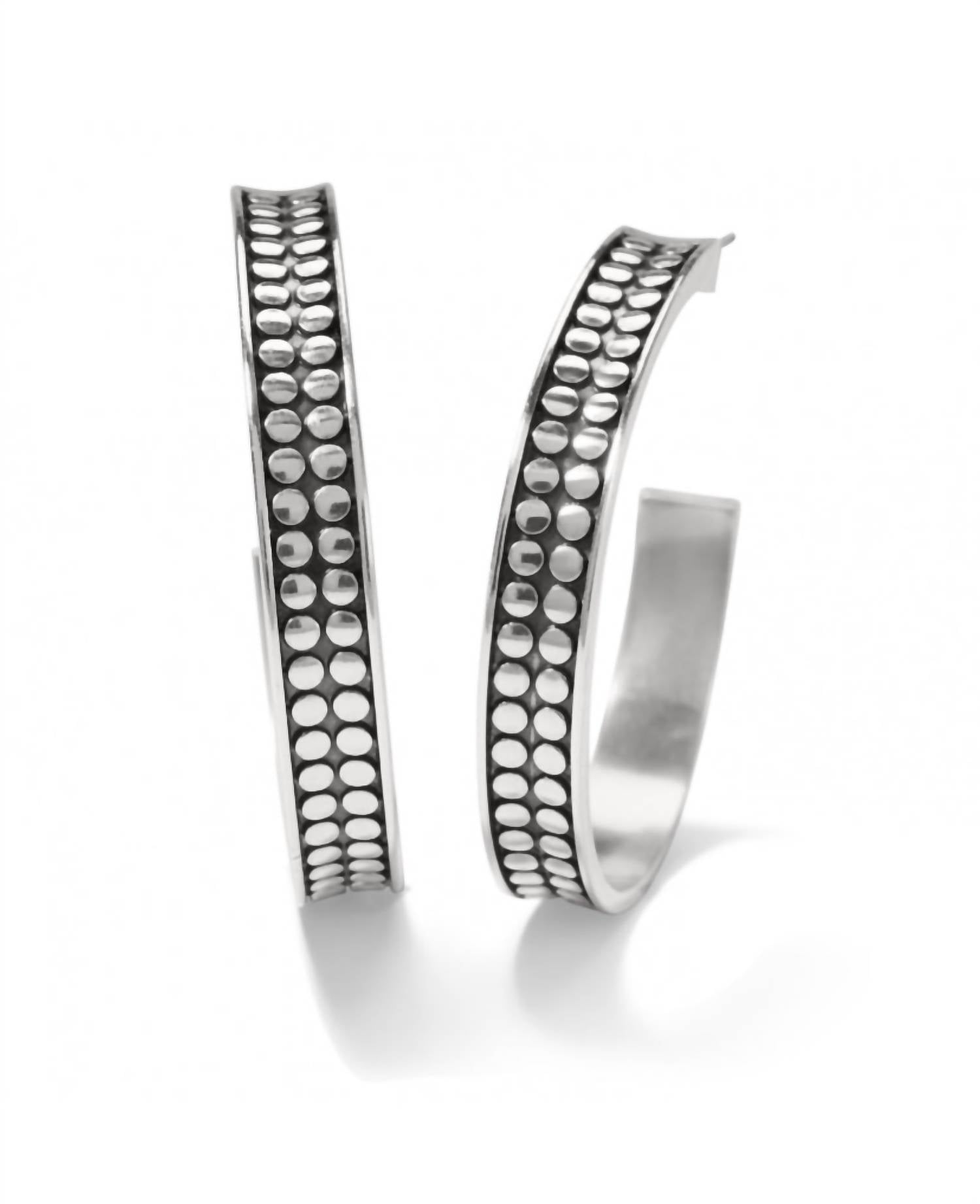 Classic earrings that will take you from season to season. Elevate your everyday look with the Women's Pebble Dot Medium Hoops by Brighton, crafted in a striking silver plating. Inspired by Balinese artisan silver jewelry, these earrings offer a bold pebble-motif design that seamlessly combines elegance with wearability. Ideal for any occasion, they are the perfect addition to your fine jewelry collection. Embrace effortless style with these versatile silver hoops.
