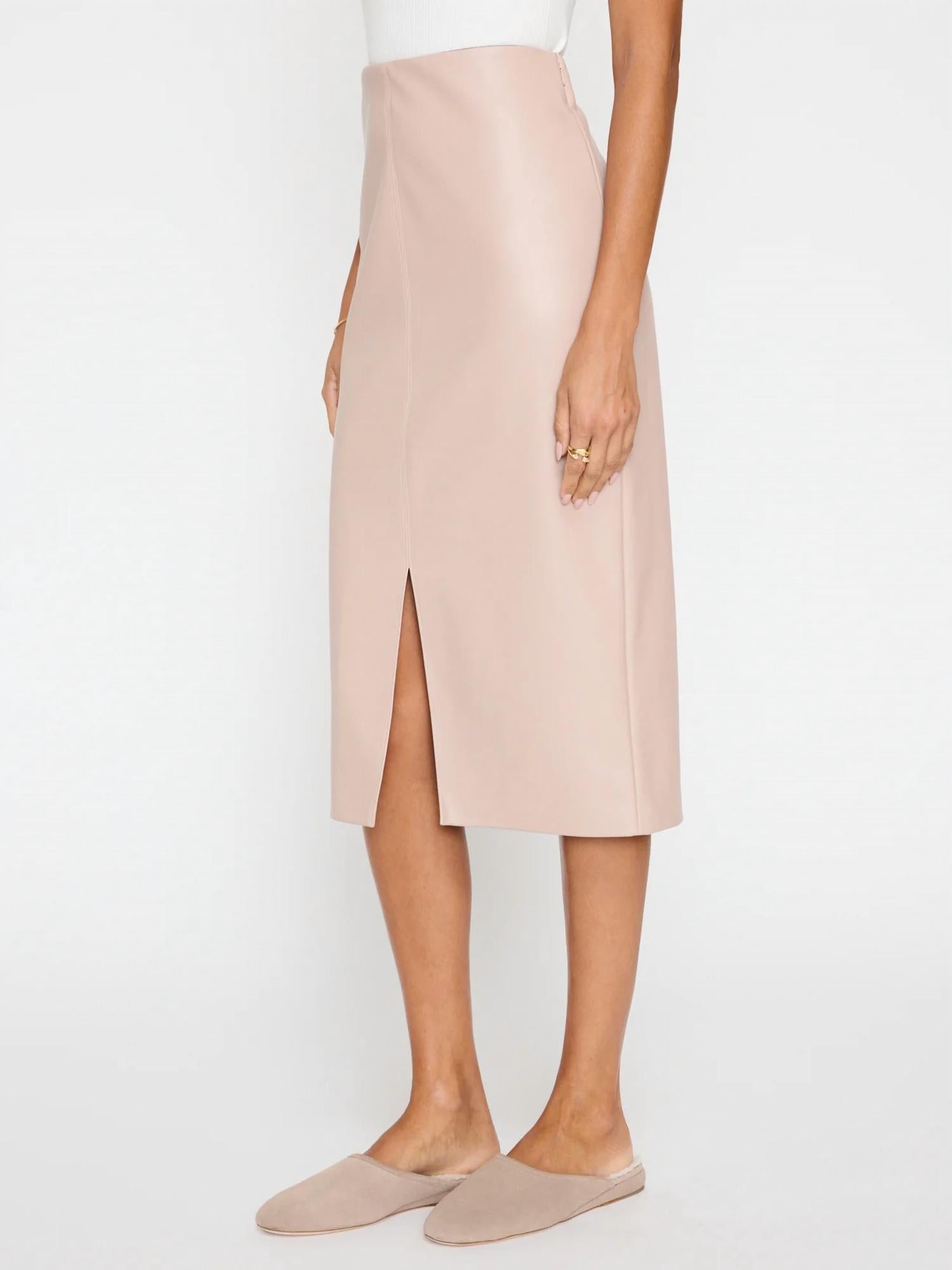 Discover the Esme Skirt by Brochu Walker, a minimalist essential in a chic fawn hue. Designed in a trendy midi length, this solid pencil skirt boasts an elasticized waistband with a side zipper for comfort and a feminine silhouette. Made from 50% Polyester and 50% Polyurethane Italian fabric, it elegantly features a center front seam with a sensual open slit. With a garment length of 29.5 inches, this skirt is perfect for the fall season, offering versatile styling for events like concerts or Thanksgiving gatherings.