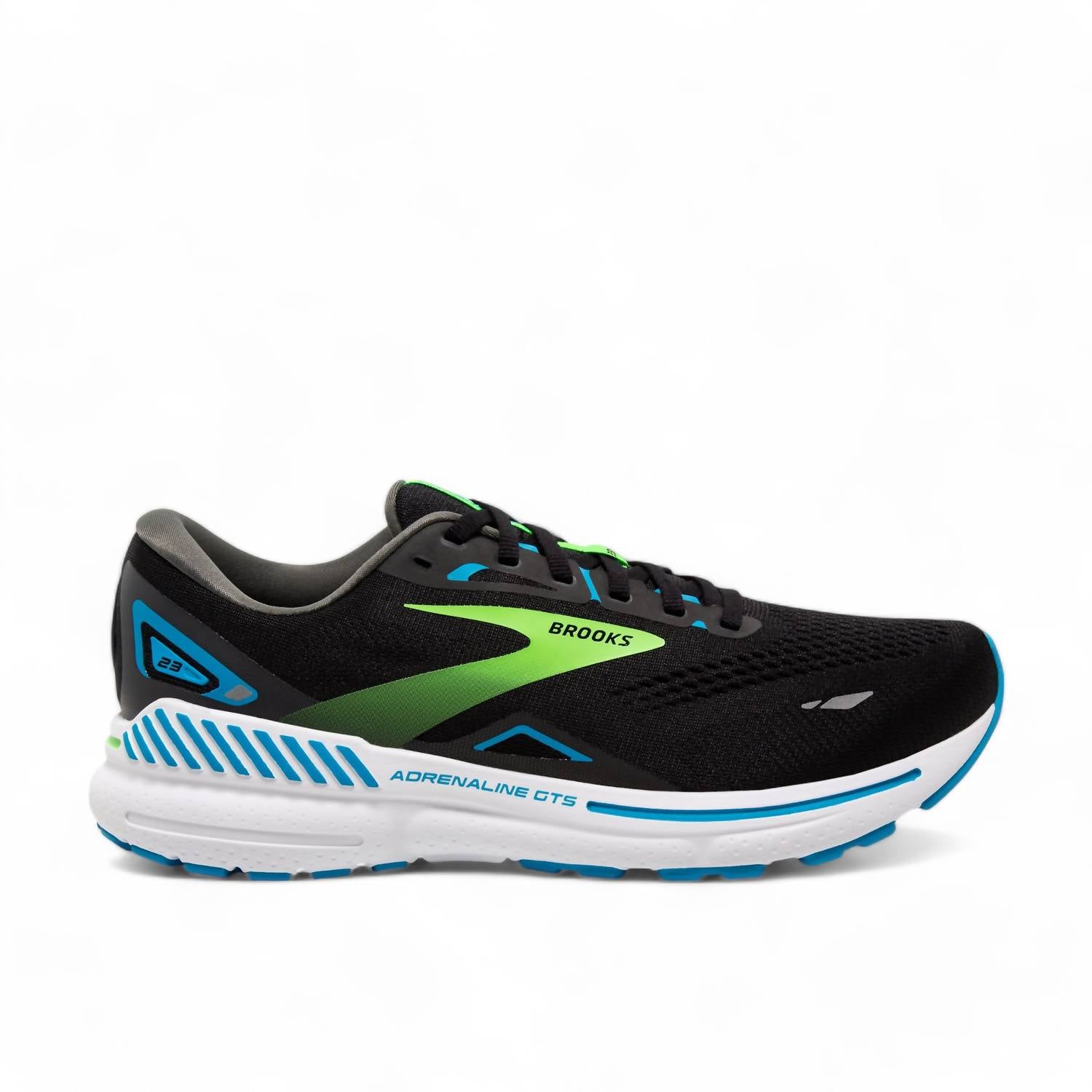 Discover the Men's Adrenaline GTS 23 Running Shoes by BROOKS, a harmonious blend of support and softness perfect for any pace. Boasting an upper made with 65.9% recycled materials and diverting 8.77 plastic bottles from landfills, these black/blue/green athletic shoes are a sustainable choice. With features such as whole body support, improved cushioning, enhanced upper, and smooth transitions, these shoes excel in support, comfort, and everyday road runs. Weighing 10.1oz (286.3g) with a 12mm midsole drop, they incorporate over 20 years of innovation for a superior running experience.