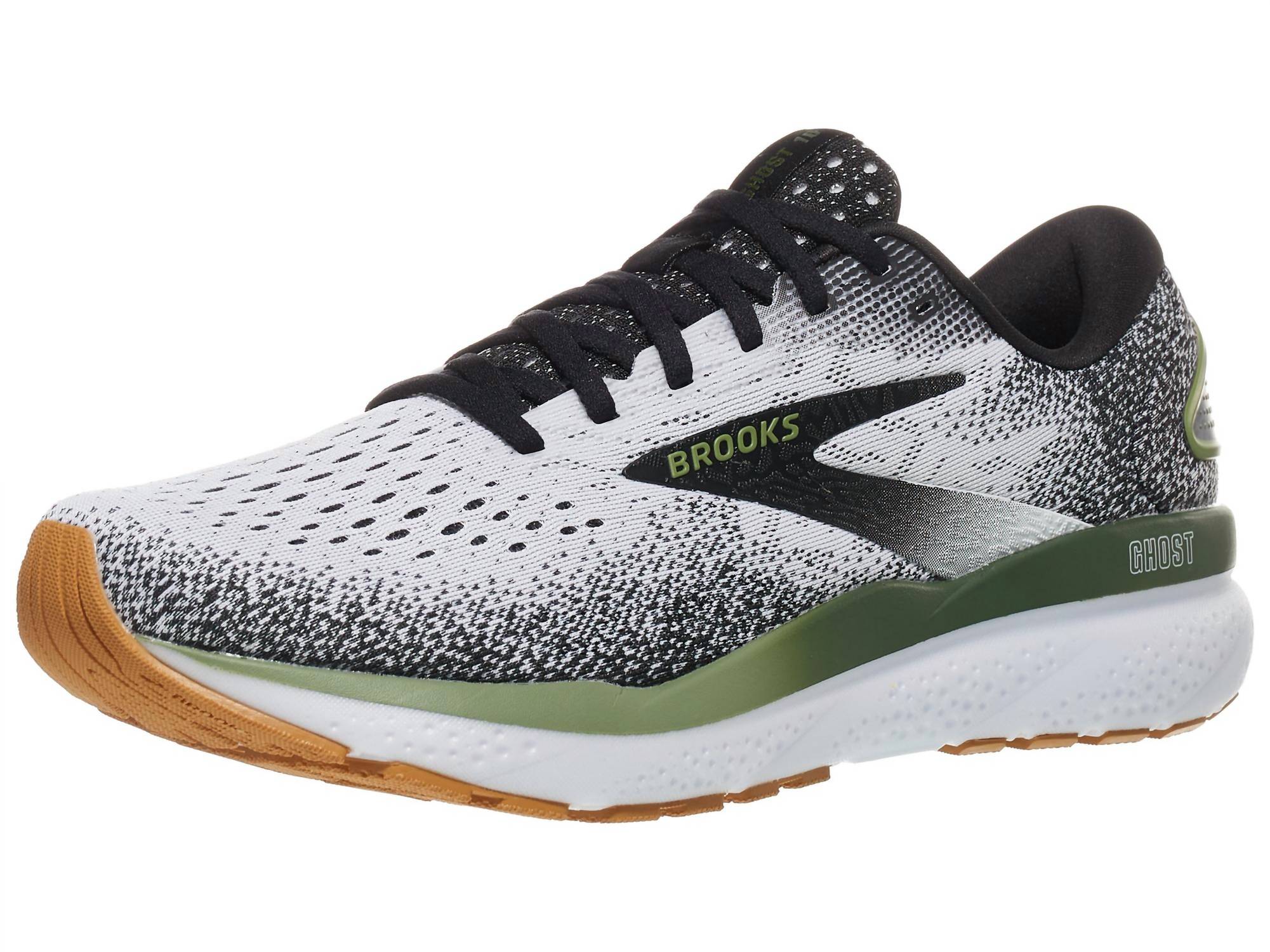 Introducing the Men's Ghost 16 Running Shoes by BROOKS, expertly crafted for both daily training and casual wear. These shoes feature an engineered air mesh upper that balances stretch, structure, and breathability with a round toe design for optimal comfort. Weighing in at 9.5 oz (269 g), they boast a heel stack of 36 mm, a forefoot stack of 24 mm, and a heel-toe offset of 12 mm, providing smooth transitions and dynamic cushioning. Available in a striking White/Black/Green colorway, the Ghost 16 is the reliable workhorse in your athletic shoe rotation.