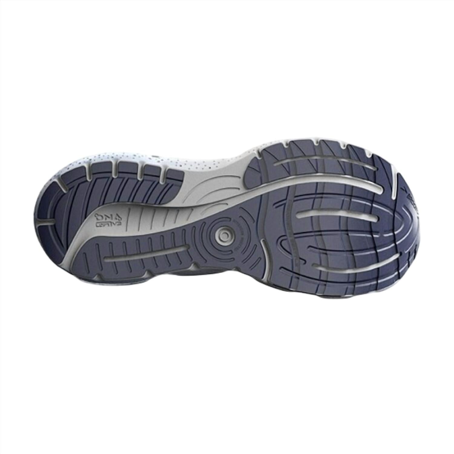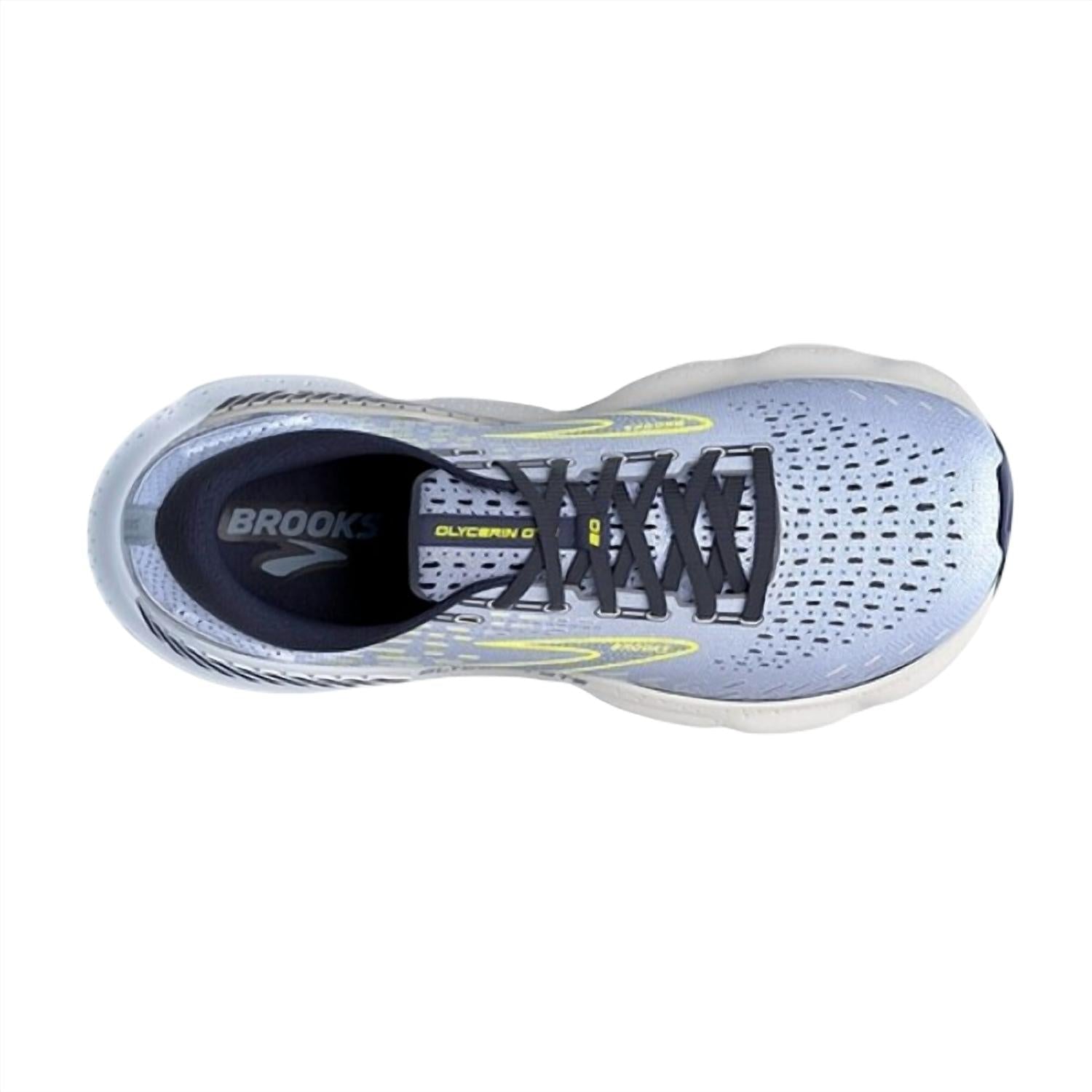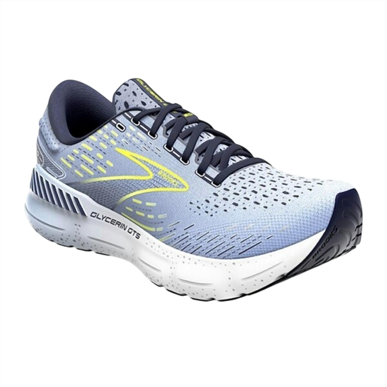 When fashion meets function. The Brooks Glycerin GTS 20 running shoes weigh 9.4 ounces (266.5 grams) and feature a 10mm midsole drop. They are designed with a breathable, engineered air mesh upper that provides a secure fit and includes 32.4% recycled materials, diverting 4.66 plastic bottles from landfills. The shoes utilize Brooks' GuideRails® support technology, which helps control excess movement of the feet, knees, and hips during natural motion. The midsole contains nitrogen-infused DNA LOFT v3 cushioning, offering lightweight, responsive, and durable softness. These shoes are ideal for road running and walking, providing a highly cushioned experience suitable for those seeking maximum comfort and support.