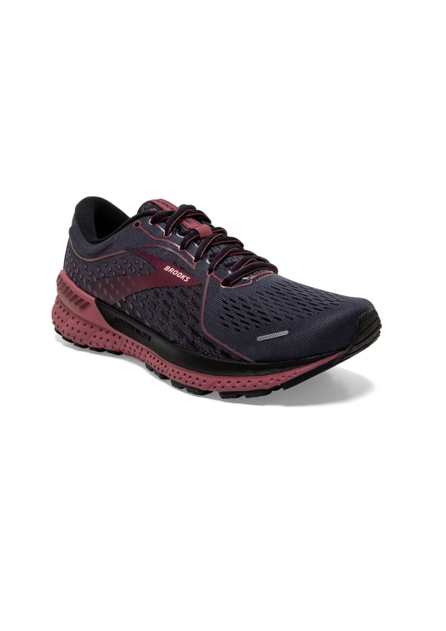 Workout in style with these adorable athletic sneakers. Elevate your workout wardrobe with the Women's Adrenaline GTS 21 Sneaker by Brooks, crafted for both style and performance. These black athletic shoes feature nylon material, engineered with advanced DNA LOFT cushioning and Blown Rubber for smart support and a soft, secure fit. The Engineered Air Mesh and 3D Fit Print technology provide a breathable, custom feel, with a medium shoe width ensuring comfort. Designed with a wedge heel and round toe shape, they're perfect for fitness sessions and athleisure trends in the spring season.
