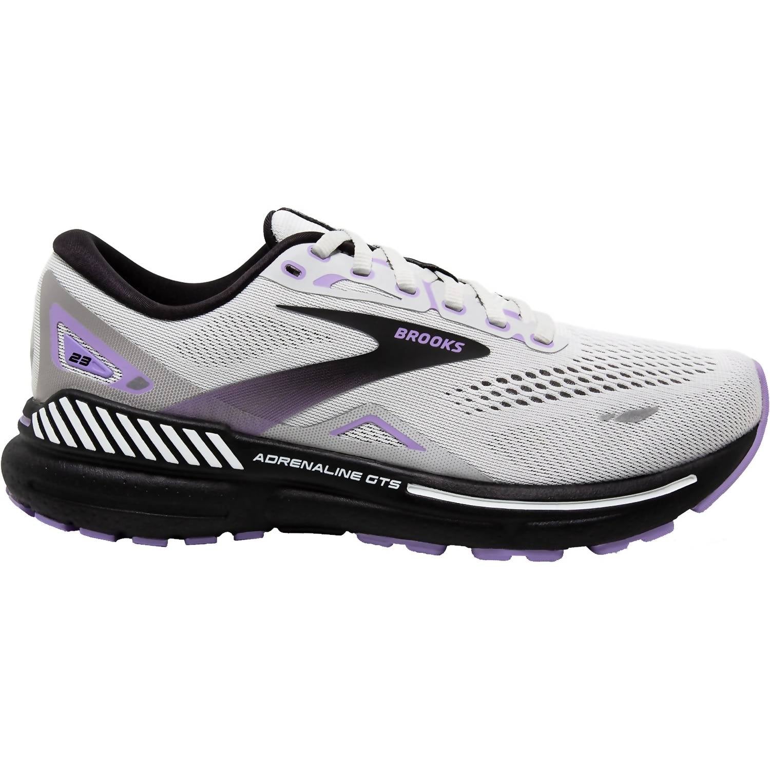Workout in style with these adorable athletic sneakers. Introducing the Women's Brooks Adrenaline GTS 23 Stability Shoes, a pioneering piece in athletic footwear designed for seamless support and comfort. Crafted with an engineered air mesh upper, these shoes offer excellent breathability and structure thanks to the 3D Fit Print. Featuring a newly updated midsole with soft and lightweight DNA LOFT v2 cushioning, they ensure smooth transitions and whole body support. Best suited for everyday runs, these shoes come in a trendy Grey/Black/Purple color palette, perfect for any athleisure look.
