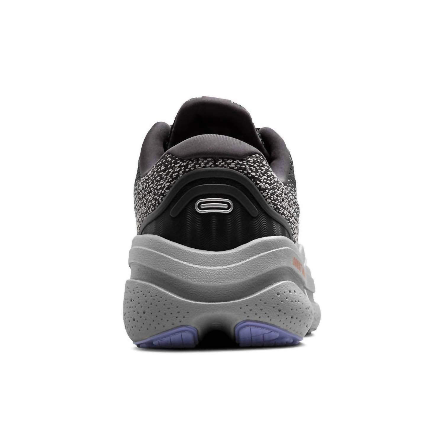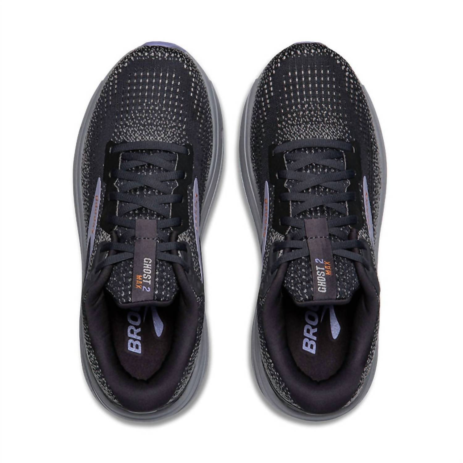 Cute, functional, and comfortable. These sneakers check all the boxes. Experience comfort and style with the Women's Ghost Max 2 Shoes by Brooks, perfect for your summer athleisure adventures. These sneakers, in a chic Ebony/Sweet Lavender/Alloy color combination, feature a round toe design. They boast a rocker shape to enhance your movement from landing to toe-off and a broad base for added stability, making them ideal for fitness or workout occasions. Enjoy the cloud-like feel of the soft, lightweight cushioning, crafted specifically for women seeking comfort in every step.