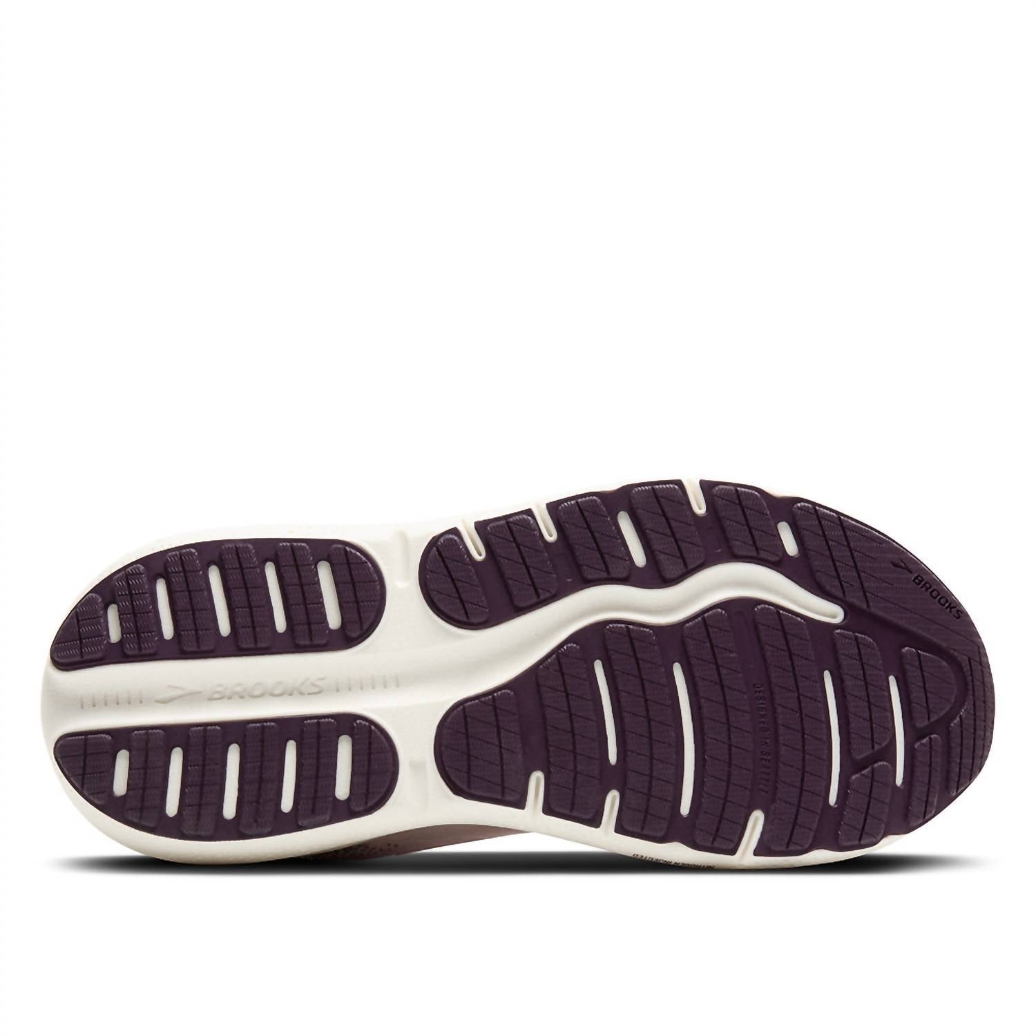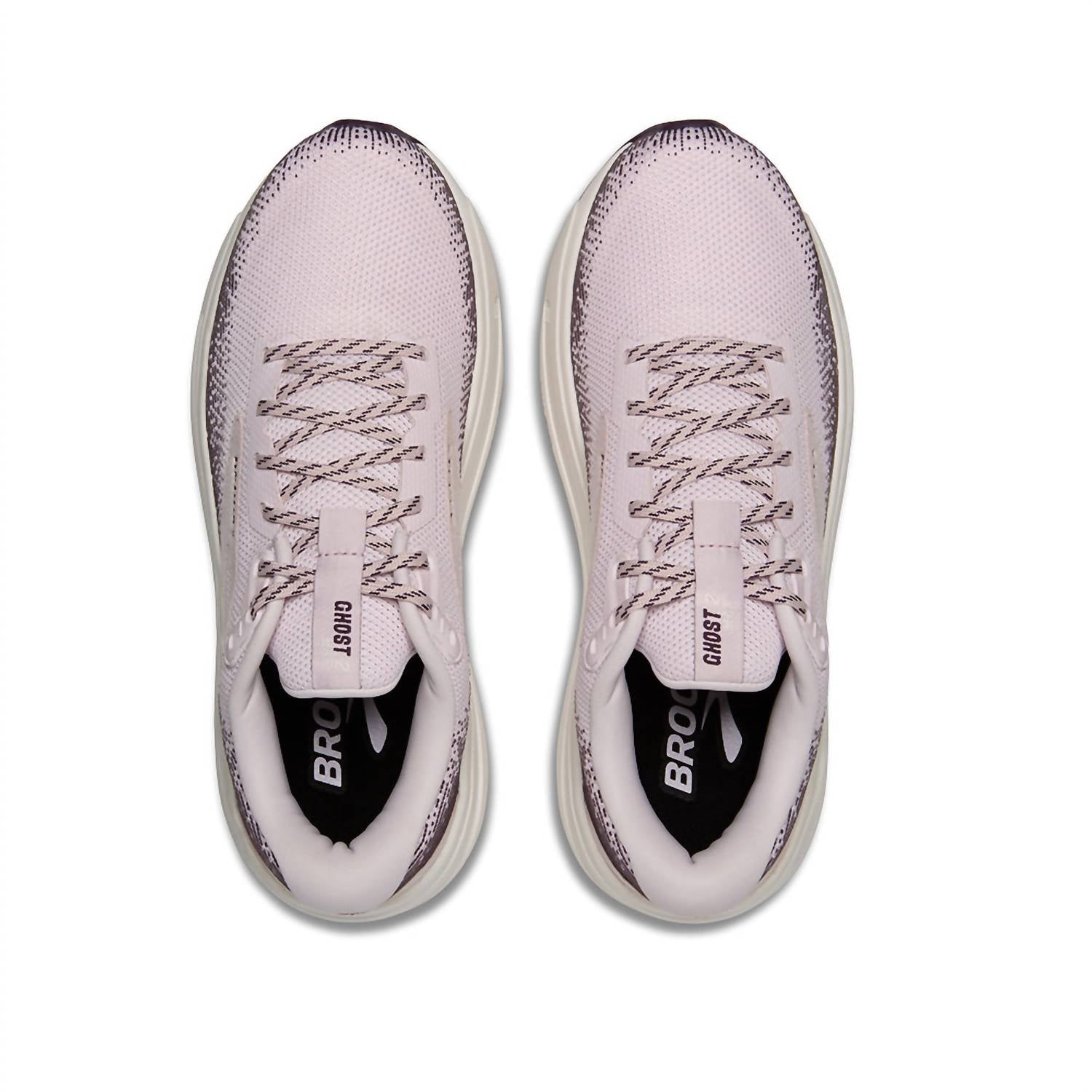 Discover the Women's Ghost Max 2 by BROOKS, the ultimate road-running shoes crafted for both runners and walkers. With a midsole drop of 6mm and a weight of 9.7oz (275g), these shoes feature a balanced, soft, and dynamic cushioning for seamless transitions. Designed in a vibrant Orchid Ice, Plum, and Coconut color palette, they offer a blend of style and functionality with a round toe and low wedge heel. Championing sustainability, the shoes incorporate 54.9% recycled materials in the upper, and are certified as a CarbonNeutral® product.