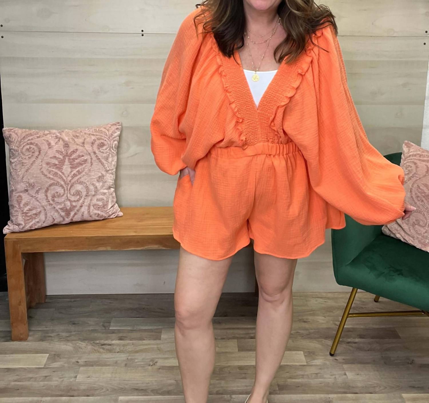 The perfect outfit choice when you you need something quick to throw on and still want to look efforlessly cool. Get ready for sunny days with the Cotton Gauze Romper by BUCKETLIST, designed in a vibrant coral hue. This romper showcases a charming V-neck and ruffled details, crafted from 100% cotton gauze for a lightweight feel. Made in the USA, it offers a convenient pull-on closure, making it a versatile addition to any wardrobe. Enjoy the relaxed design that's perfect for casual outings, complete with handy pockets for added practicality.