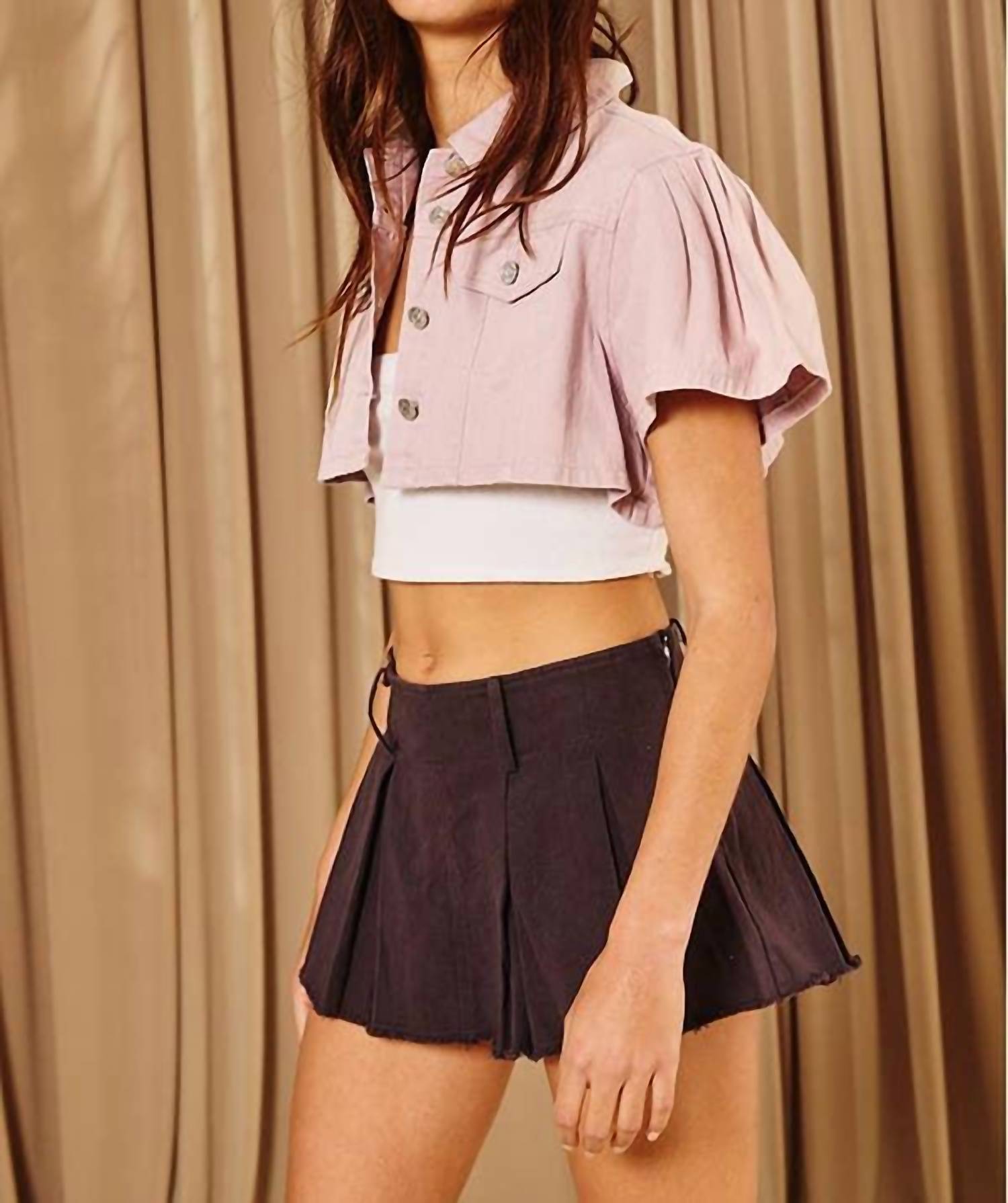 Elevate your summer vacation wardrobe with the Lavender Short Puff Sleeves Cropped Denim Jacket by BUCKETLIST. This women's jacket features a chic cropped silhouette with short puff sleeves and handy chest pockets, perfect for a laid-back yet stylish look. Made from 100% cotton, this solid-patterned piece offers comfort and breathability. Closure: Button closure.