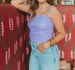 Meet the Jolee Tank Top by BuddyLove in a stunning Lilac hue, crafted for bold style and comfort. This vegan leather cropped tank features spaghetti straps and a squareneck, making it a perfect addition for warmer weather. Made from a cotton blend, it combines 50% PU and 50% cotton for the top, with a lining of 100% polyester. The side ruching and zipper back closure ensure a flattering fit, while the fabric has no stretch. Please note, the Jolee Top runs small, so consider sizing up for a more comfortable fit.