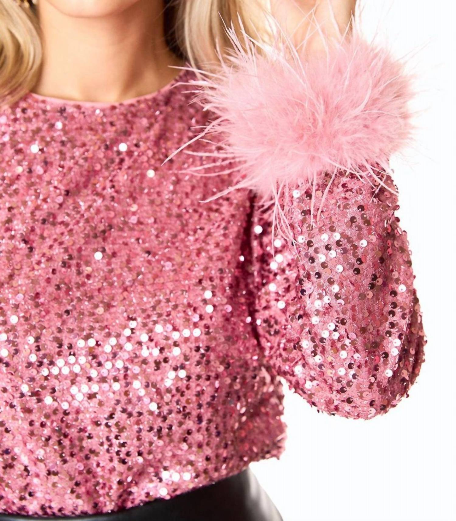 A timeless blouse that will never go out of style. This long sleeve piece dazzles with a full sequin body and feather cuffs, complemented by a comfortable, fully lined interior. Crafted from 100% Polyester for both the self and lining, it measures 20.5" from shoulder to hem. The top boasts a crewneck and a textured pattern, finished with a button closure for an elegant fit.
