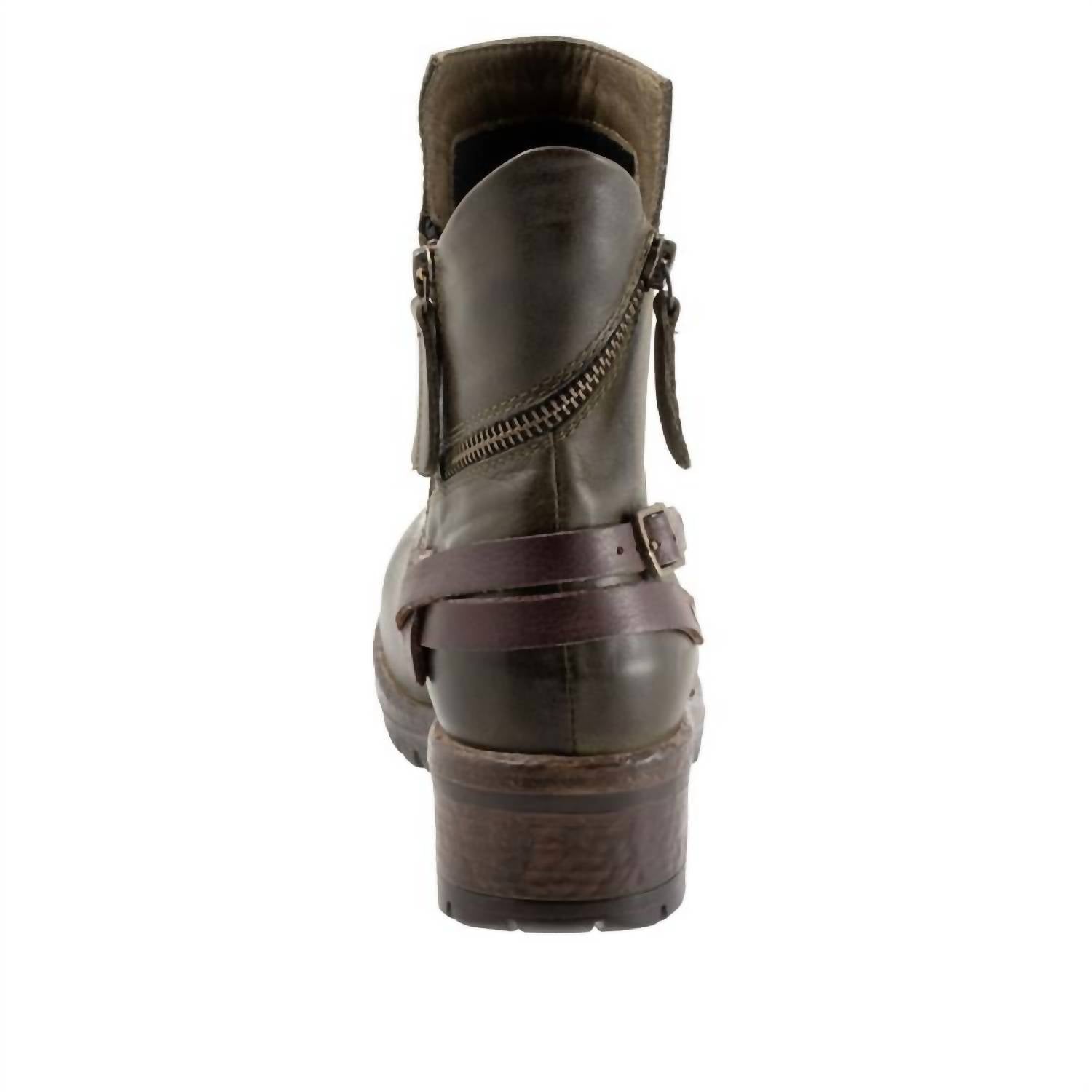 Step out in style. Perfect blend of trendsetting design and comfort. Featuring a geometric leather upper and moto-inspired buckles. Lined with textile and boast a thermo rubber compound sole for durability. 5" full-length inside zipper ensures easy wear. While the round toe and softly chunky 1.75" heel provide all-day comfort. Designed with a circumference of 10.5" and a shaft height of 6".