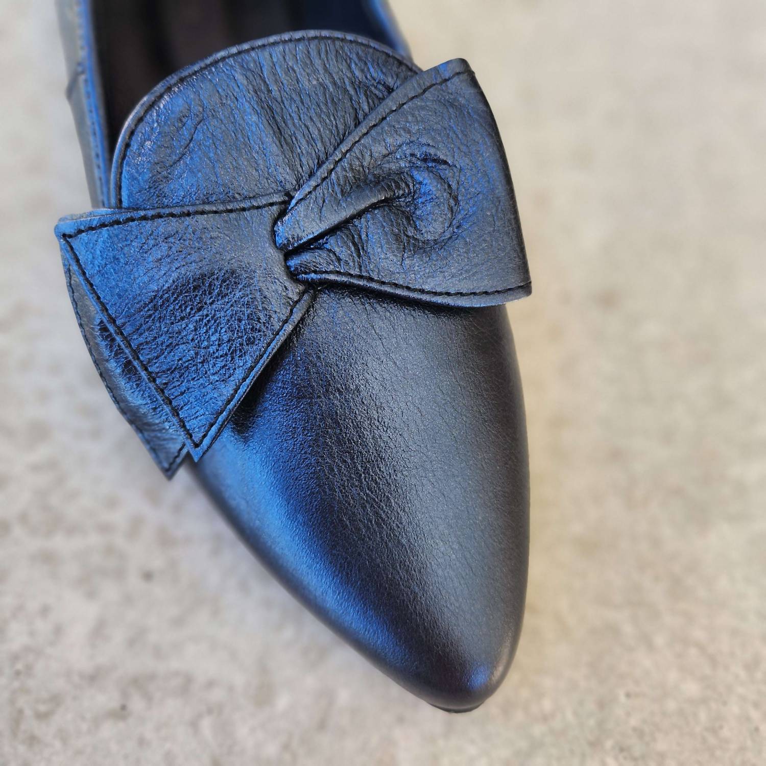 A classic loafer that is both comfortable and polished. Step out in elegance with the Women's Pointed Toe Loafer Flat Shoes by Bueno, a perfect blend of style and comfort. Crafted from luxurious leather, these flats feature a chic pointed toe adorned with a matching leather bow, all in a sophisticated Navy Shimmer hue. The subtle metallic heel adds a touch of dressy flair to this flat (1" & under), effortlessly transitioning from special occasions to everyday elegance. Ideal for the modern woman, these shoes promise to make you feel special with every wear.