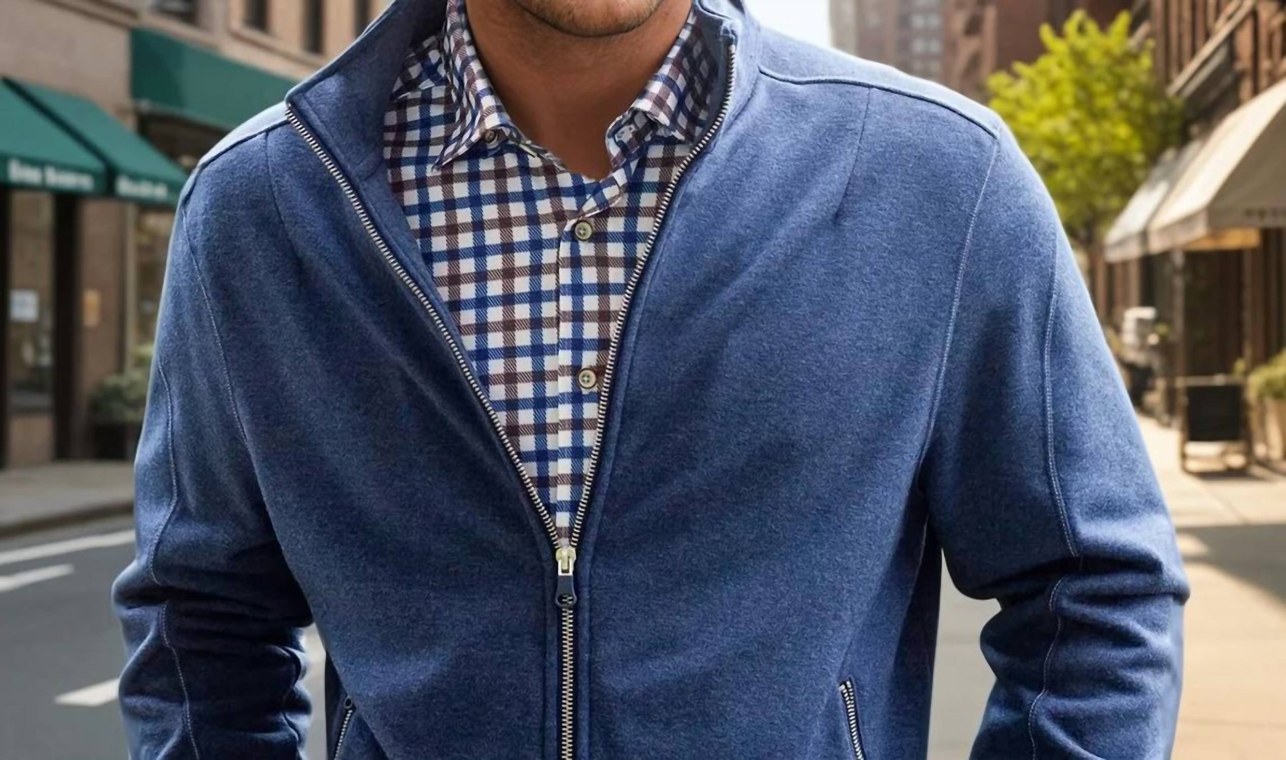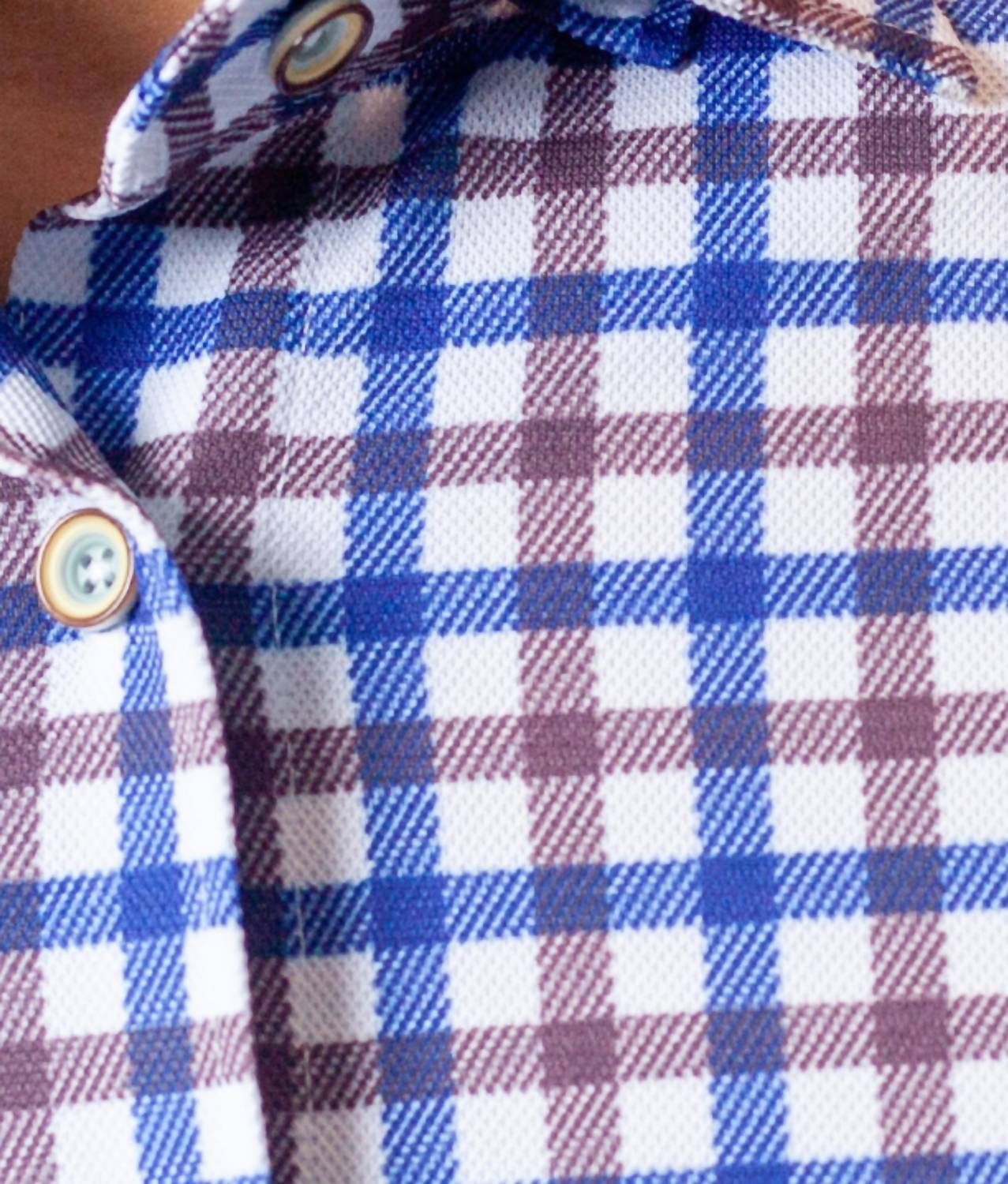 Introducing the Check Mate Long Sleeve Tech Shirt by Buki, a must-have for modern men who value style and comfort. This navy and brown plaid and check shirt features long sleeves, a two-piece collar with a hidden button-down, and is designed for a clean, untucked look. The proprietary technical fabric is not only wrinkle-resistant and machine washable but also offers four-way stretch, moisture-wicking properties, and cooling yarn for ultimate comfort. Closure: Button closure. Perfect for travel or workwear occasions, this shirt is an essential piece for Father's Day or any day.