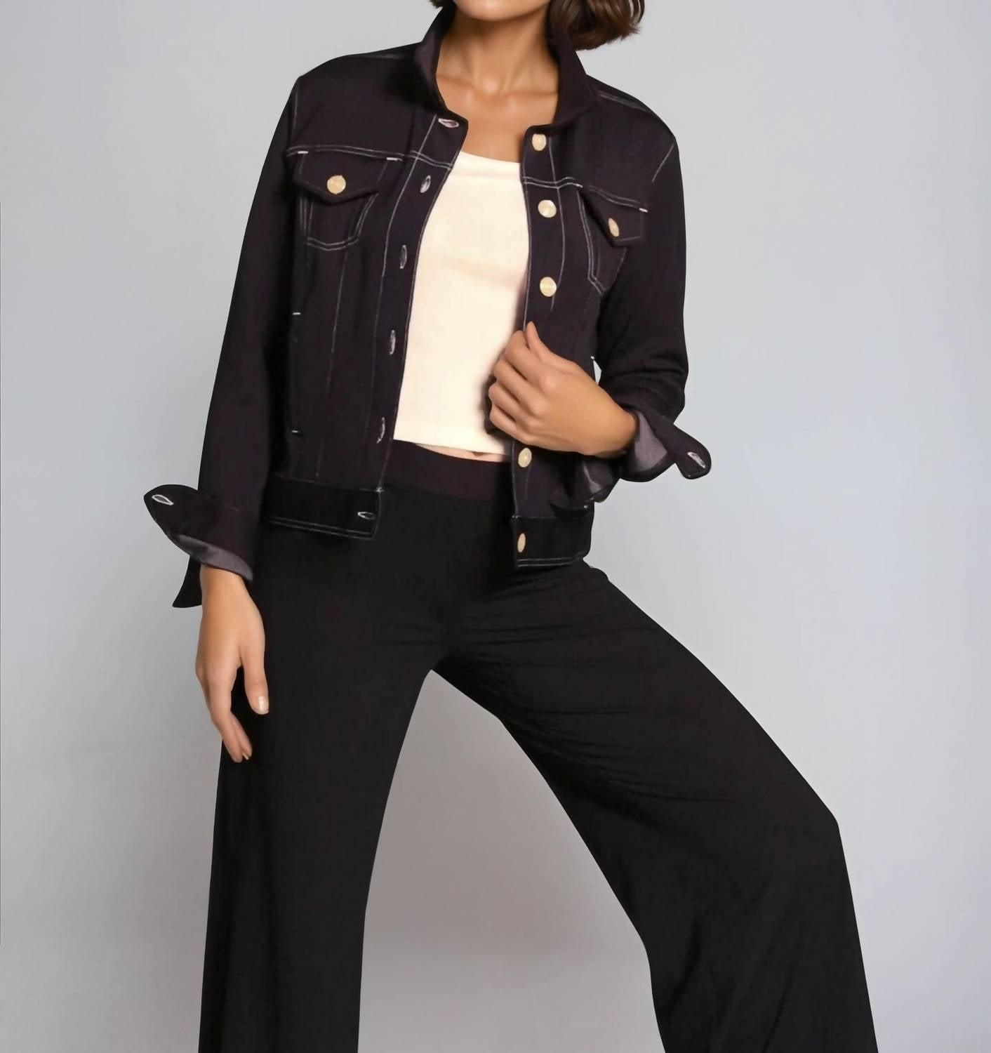 Throw this adorable jacket over just about anything for an effortlessly stylish look. Experience the cutting-edge Neo-tech Jacket by Buki, a must-have in black for the modern woman. Crafted from a Buki Neo-Tech fabric, this long sleeve textured jean jacket features four-way stretch and wrinkle resistance, ideal for travel and everyday wear. The jacket boasts a collar neckline and two inside pockets perfect for keeping essentials like your smartphone secure. Designed in Seattle with practical machine wash care instructions, this piece is as easy to maintain as it is to wear.