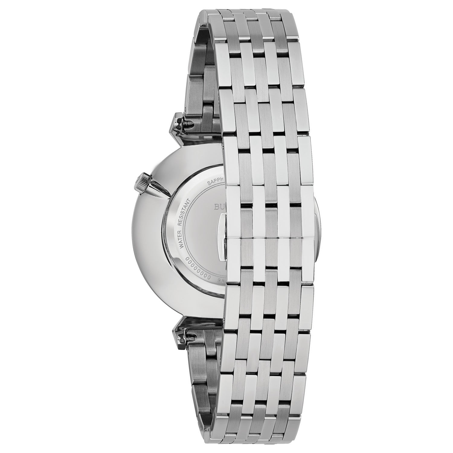 The case of this watch is constructed of high-quality stainless steel. The dial is blue and protected by a durable sapphire crystal scratch resistant with up to 30 m (100 feet) water resistance. The bracelet is silver stainless steel. The movement is quartz