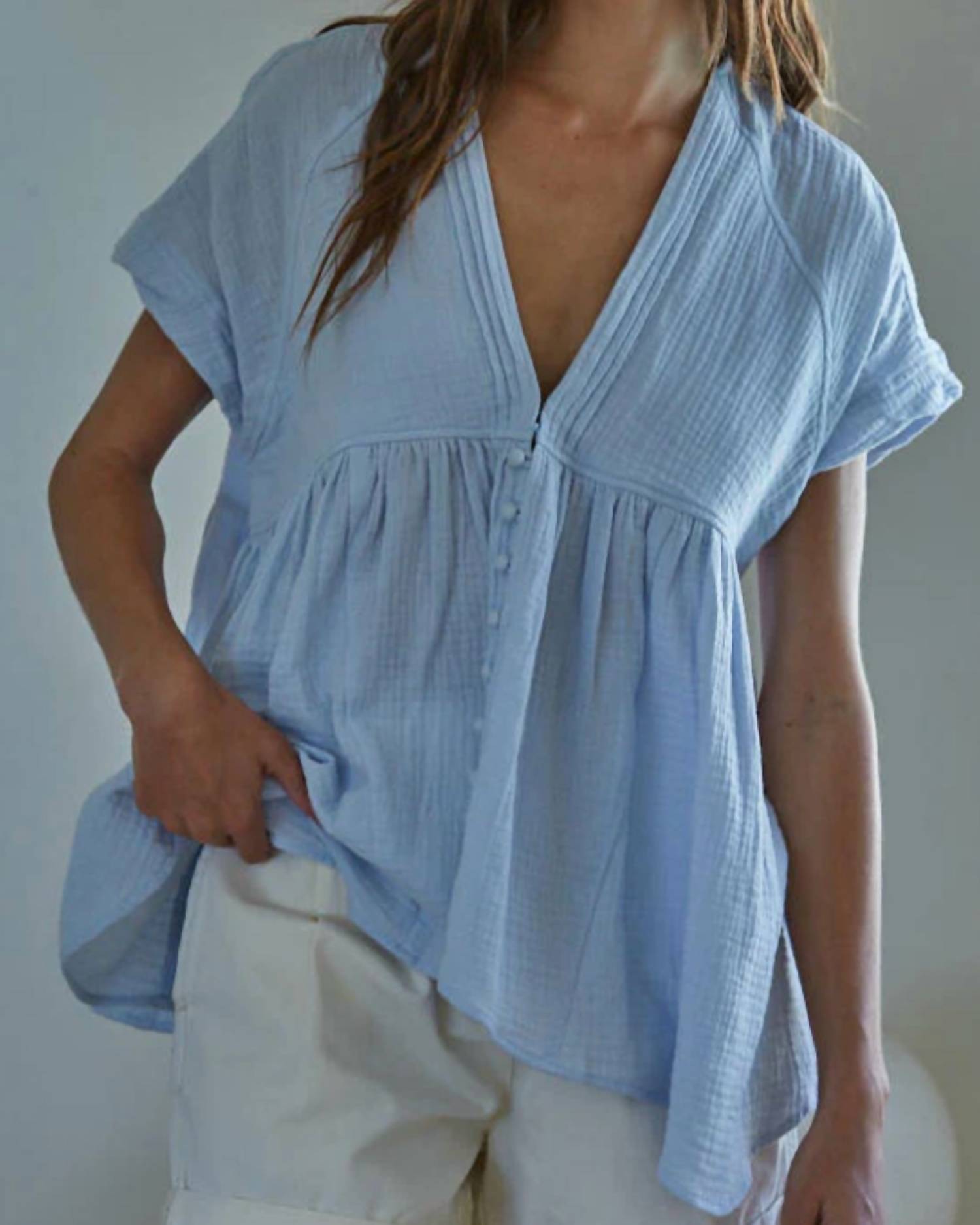 A versatile blouse that works from desk to dinner! Introducing the Aurelia Woven Top by By Together, a sublime light blue blouse perfect for minimalist summer styling. This women's blouse features short sleeves and a flattering V-neckline, making it ideal for engagement occasions. The solid pattern ensures versatility, while the button closure provides practicality. Embrace elegance with this exquisite addition to your wardrobe.