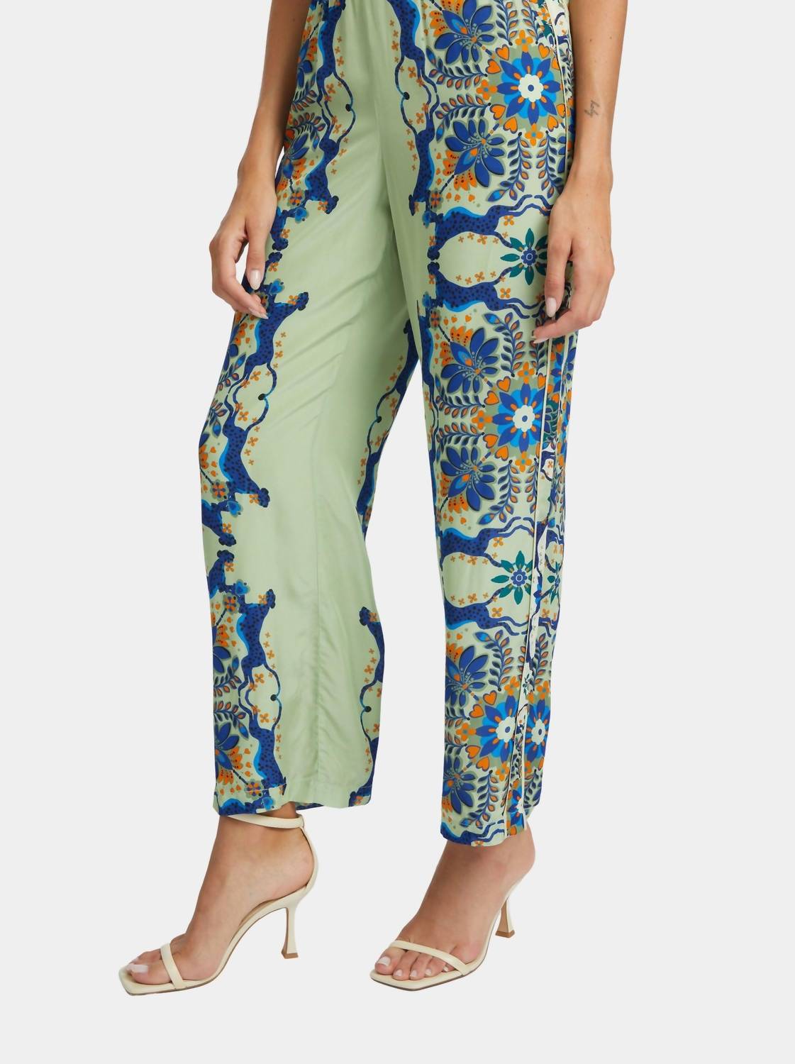 Introducing the Max Wildcat Tapestry Pant by CABALLERO, a standout addition to any summer wardrobe with its chic wildcat print in royal blue and sage. These women's pants feature a straight leg style with a regular fit and mid-rise waist, making them ideal for a vacation-ready, boho chic look. They come with convenient pockets and a pull-on closure for easy wear. Easy to care for, these pants are machine washable and should be laid flat to dry.