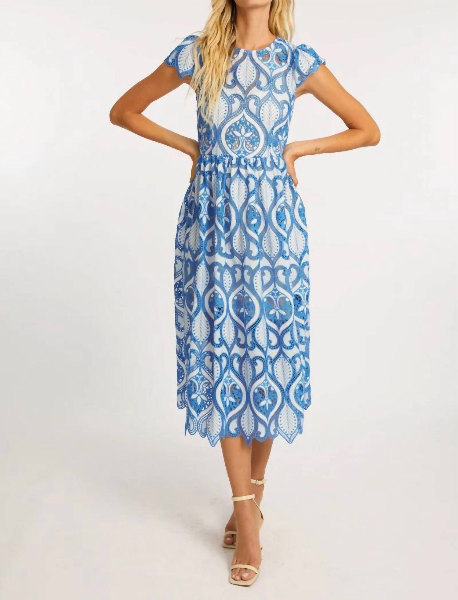 Just add slides or mules and you are good to go. The Raquel Dress is a refined midi silhouette featuring a fitted bodice and a flowing skirt for an elegant, feminine look. Contrasting lace adds a sophisticated touch, while scalloped sleeves and hem bring delicate, romantic detail to the design.