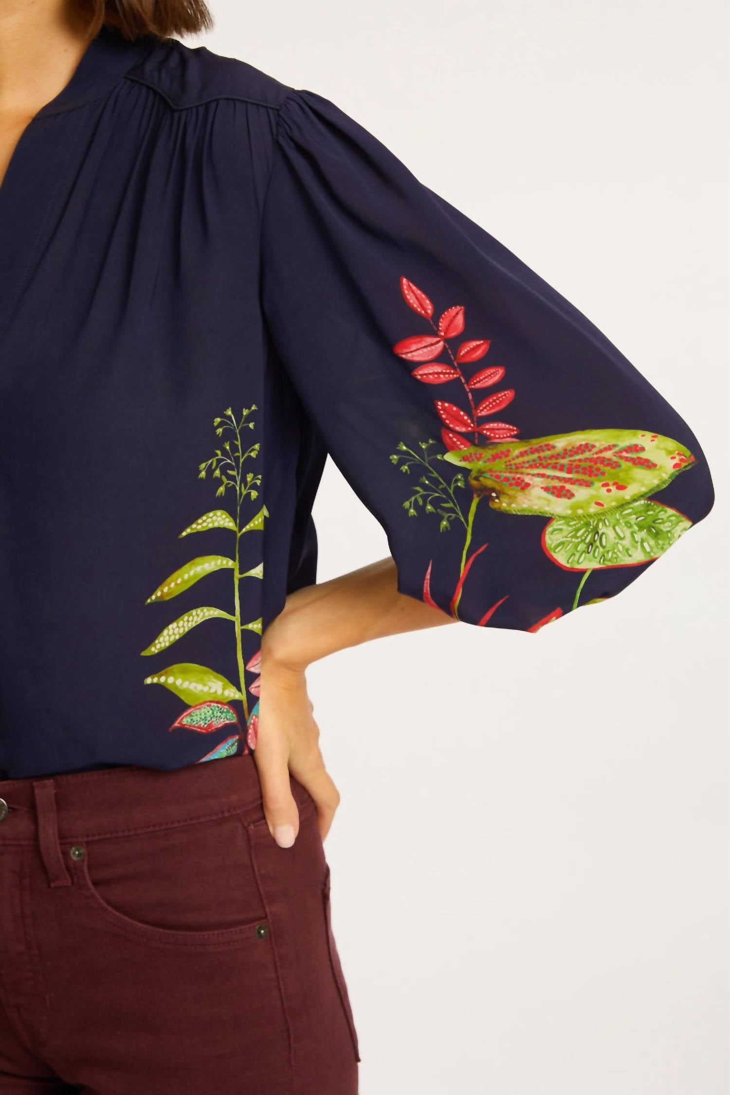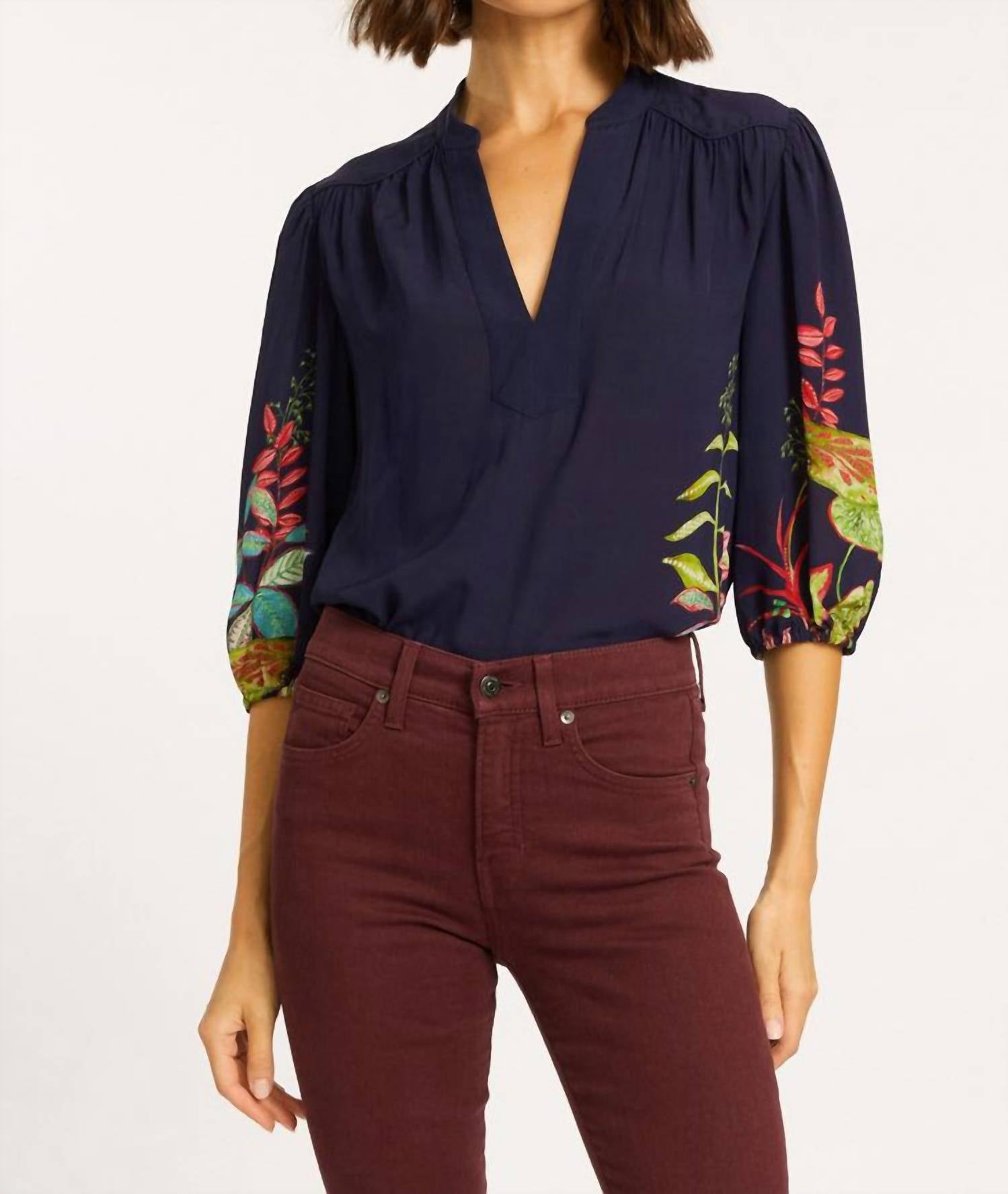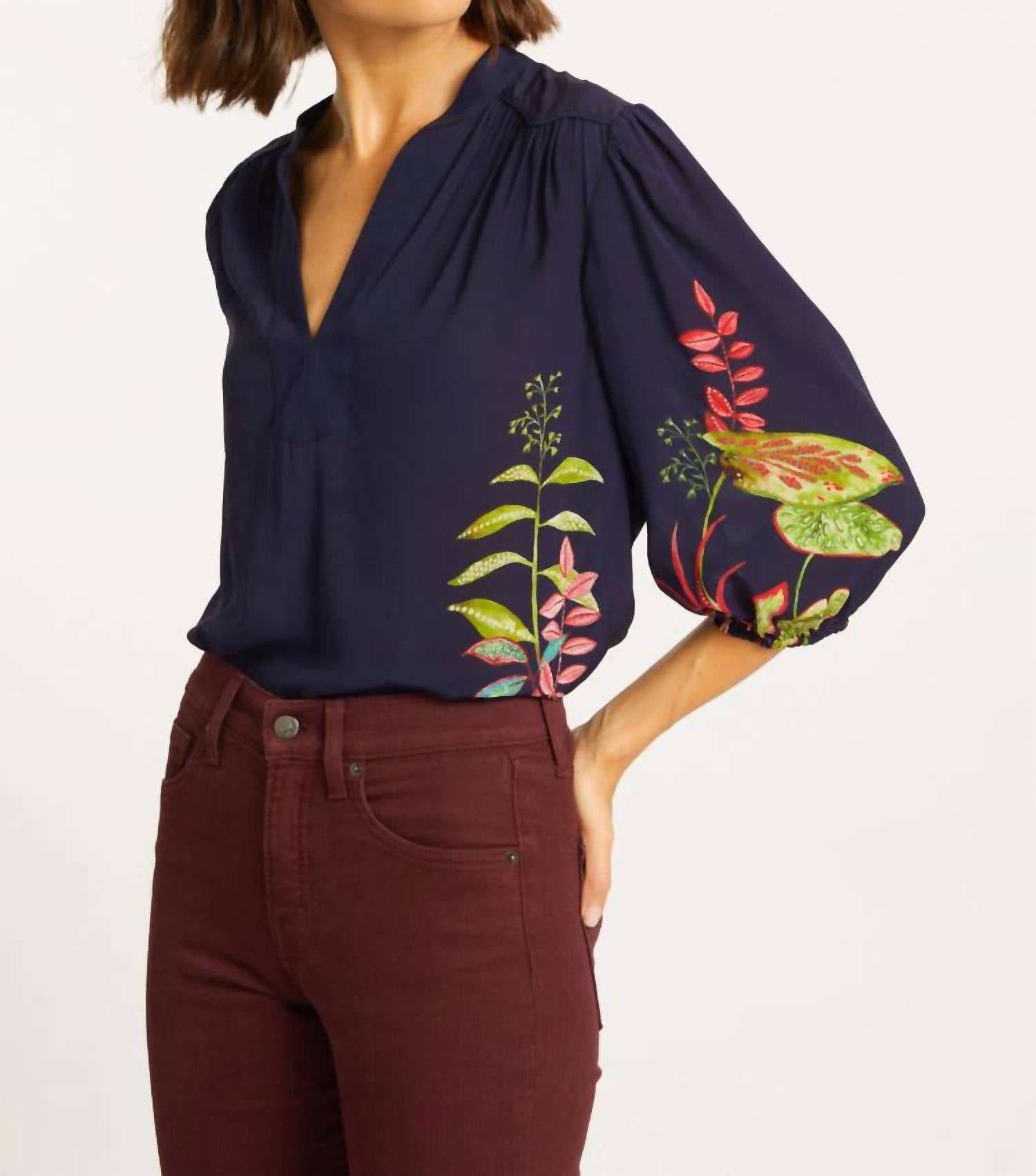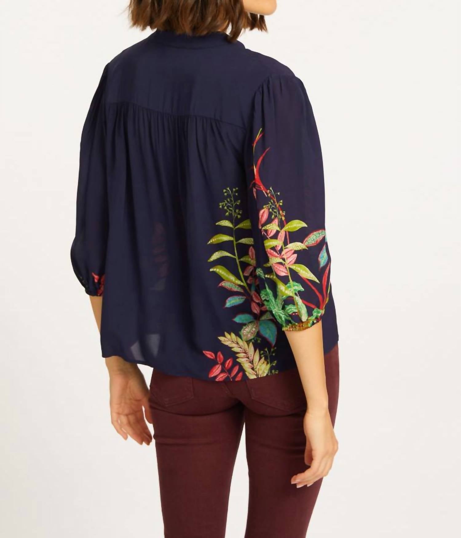 A timeless blouse that will never go out of style. Elevate your wardrobe with the Simone Top by CABALLERO, showcasing a three-quarter sleeve with elastic cuffs for a relaxed fit. Crafted from 100% viscose, this blouse in deep dark navy blue features a tropical leafy print near the bottom, offering a touch of summer elegance. It boasts a sophisticated V-neckline and a combination of a curved front yoke and straight back yoke. Designed for effortless style, this pull-on blouse is best maintained through dry cleaning.